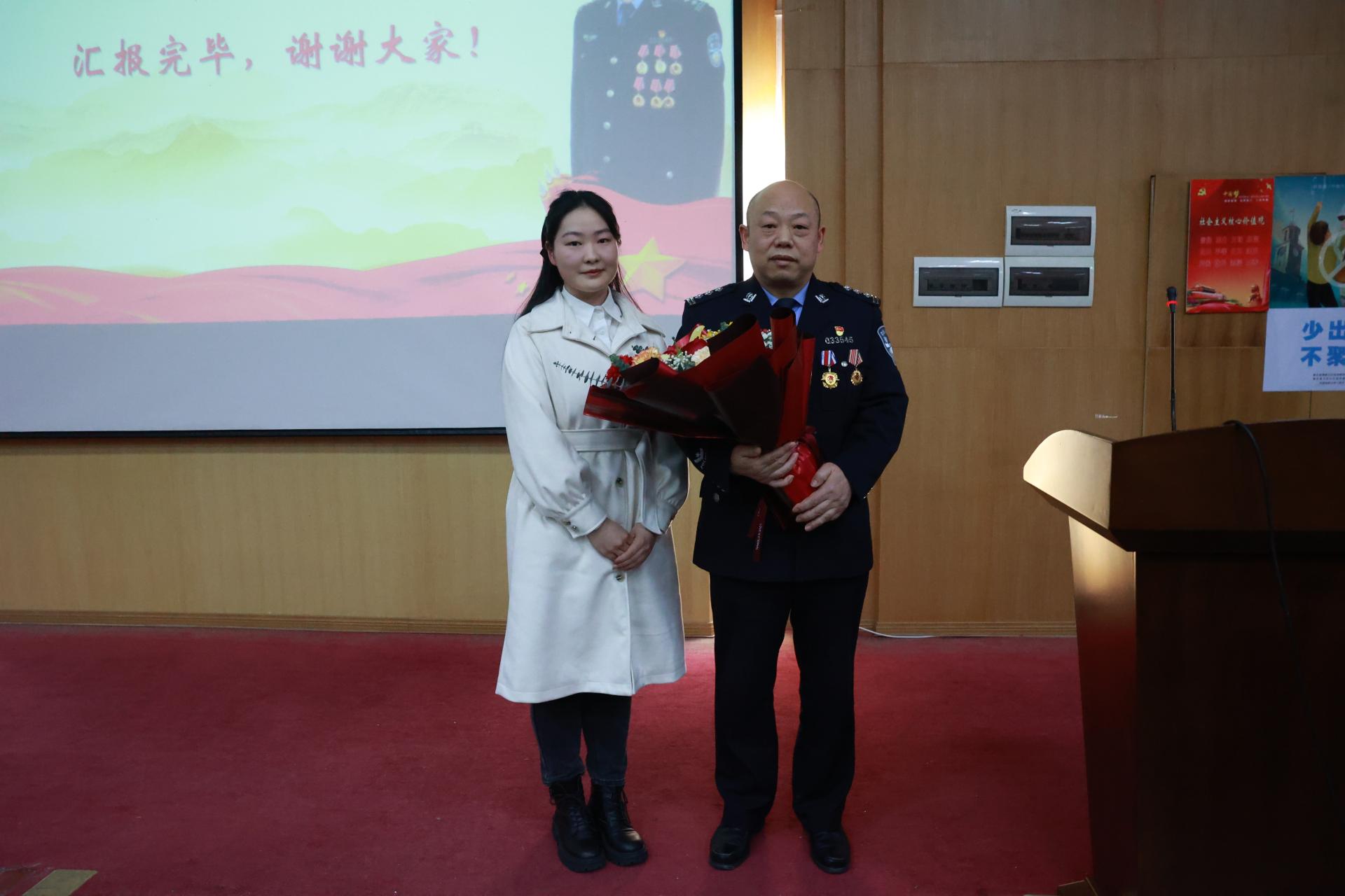 胡永鹏警官用朴素的语言讲述了自己的成长经历,他把父亲的庭训当“家训”。回忆了父亲胡有德作为一名张富清式的老党员、老英雄对他的影响,让他对忠诚有了更深的理解,始终牢记父亲的叮嘱:“听党话、跟党走”。转业后主动向组织提出到基层派出所工作,从小事做起,爱岗敬业为民。他把细实的作风当“家风”,把群众的难事当“家事”。他讲到:“一定要像钢铁一样坚守在岗位上,肩膀上扛的是群众的信任”,正是因为这样的信念,胡永鹏同志侦破重大案件400余起,找回车辆530多台,找回手机610多部,用自己的实际行动赢得了人民群众的信任,累计收获群众赠送锦旗320面。“胡永鹏工作室”在人民群众的期待中挂牌成立,他在工作中把报警求助的人当成“家人”,办理群众案件“等不得、推不得、慢不得”,不能伤了群众的心,做群众满意的“孺子牛”。胡永鹏同志用自己亲身鲜活的事迹向我们展示了一个优秀共产党员的心系群众、开拓进取、争创一流的奋斗担当,用自己的行动捍卫了对党忠诚,服务人民的铮铮誓言。授课结束后,学生党员代表,青马明志党支部组织委员陈雅文同志向胡永鹏警官献花,向英模学习、致敬。