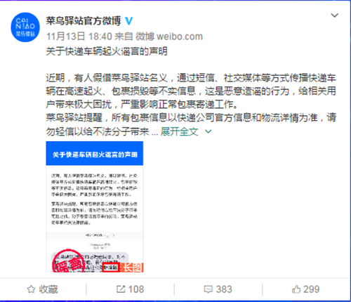 【保卫处温馨提醒】菜鸟驿站辟谣“快递车烧毁短信”, 包裹信息以官方为准!