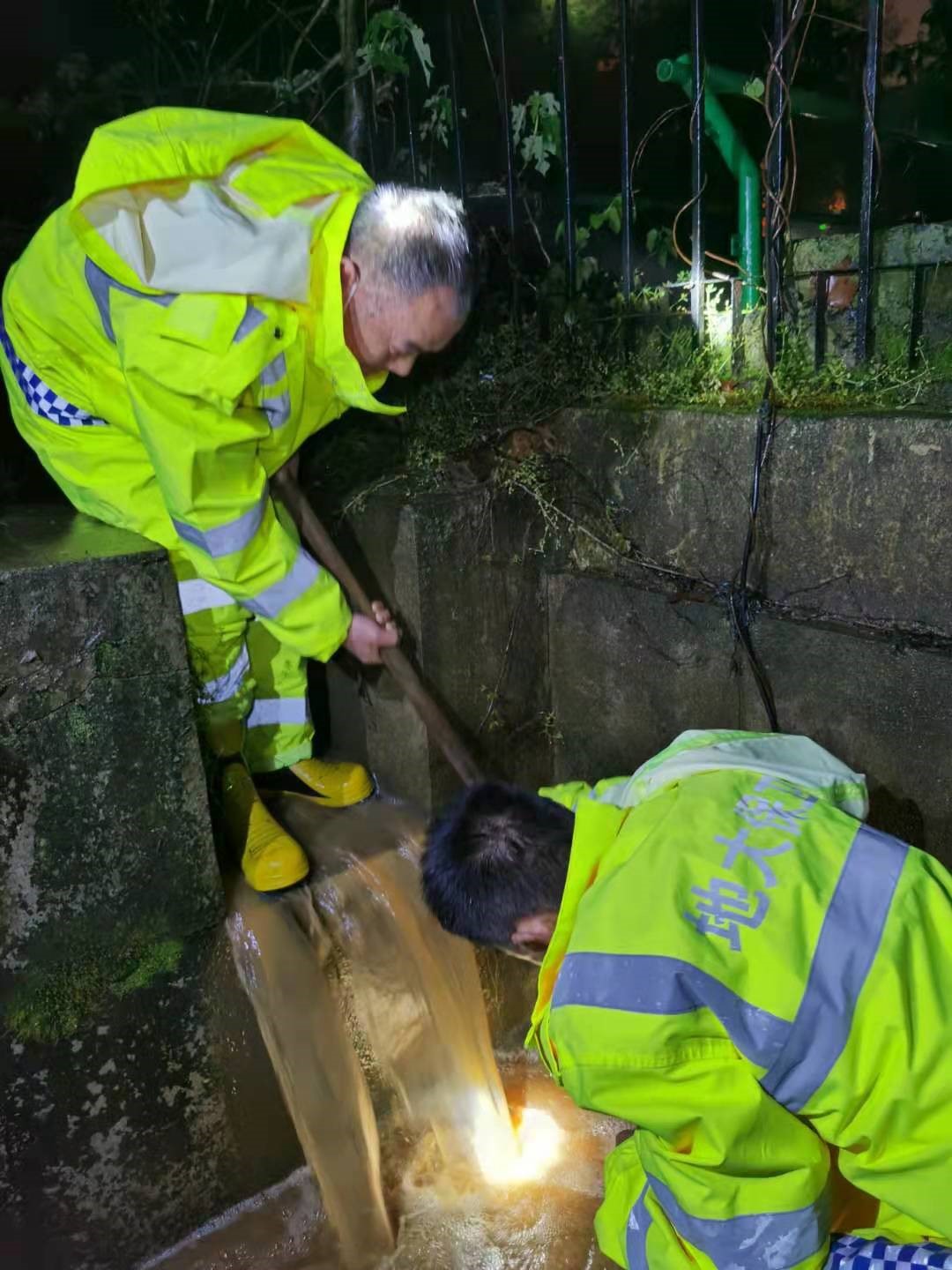 3月31日夜晚,雷雨交加,北区边界围墙处排水沟严重堵塞,山水急流而下,肆意的山水冲进了园区宿舍,我科工作人员带领队员在雷雨中用铁锹疏通排水口,由于排水沟年久失修,工具无法进入,安保队员们只能用手指一点一点抠出树叶残渣和常年沉淀的泥土。半个小时过去了,排水沟水位急速下降,所有的工作人员鞋子湿透,大家没有半分怨言,反而在处理完排水沟了以后,联想起外卖点的泥泞之路给师生带来的不方便,迅速消失在倾盆大雨中,赶赴下一场战斗。