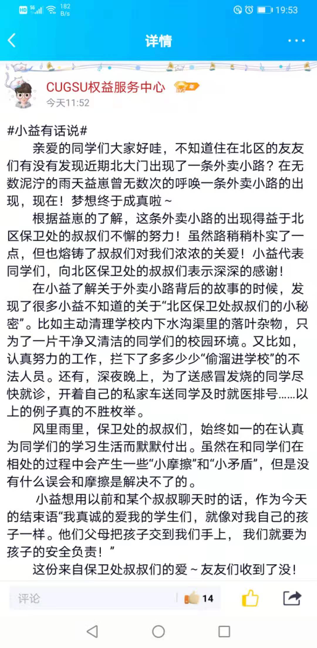亲爱的同学们,感谢你们对我们工作的认可,我们将继续努力做好保卫服务工作,遇到任何困难请及时拨打24小时求助电话67883110.