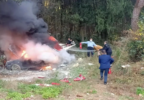 2021年11月26日中午13:00左右我工作人员突然听到一声巨响,路上同学还开玩笑说又是部队在打靶(附近部队经常打靶,同学们已经习以为常)。但北区二科科长杨中秋却感觉不对头,从事保卫工作二十多年,出于职业敏感性他带人跑到开阔地向声音来源处张望。山高林密大家并未看到什么情况,于是说:没什么情况回去吧!肯定是附近部队又开始打靶在。杨中秋却说:不急等等再观察下。就在这时远处山林冒气了一股浓烟,杨中秋同志说:不对,这是肯定是着火的烟。他马上下达命令启动应急预案,组织应急消防队带上消防设施马上赶到着火点。,队员接到通知时有的还在吃饭,有的队员还在午休。火情就是命令,队员们丢下饭碗穿上单薄的衣裤冲出房门带上灭火设施赶往现场。到现场后大家吃了一惊,只见一辆轿车停在山脚,熊熊大火已经将轿车吞没。油箱有没有汽油?会不会暴炸?这些想法在队员们脑海一闪而过。看到火势凶猛后面就是山林,如果火势延续到后门几米那么将引起山火蔓延,后果不堪设想。现在情况哪怕是从事保卫工作二十多年的杨中秋也倒吸一口凉气。情况刻不容缓。杨中秋冷静指挥,根据情况迅速把队伍分成三组,一组负责将随身带来的灭火器现在灭火,第二组组马上就近消防栓链接水带,第三组到附近食堂收集灭火器。第一时间报“119”“110”请求支援,并将情况向处领导汇报。