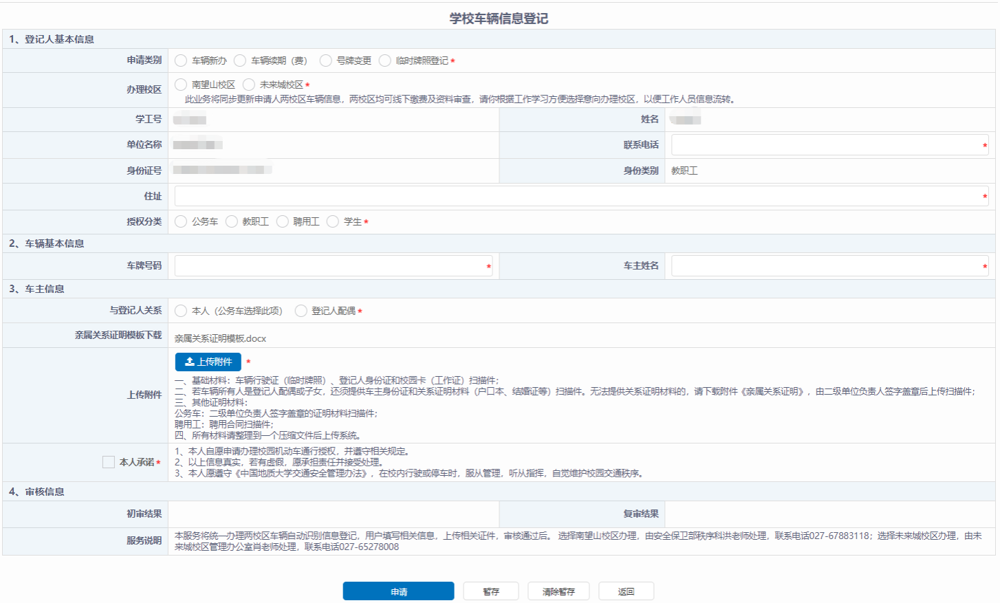 1.本人自愿申请办理校园机动车辆通行授权,并遵守相关规定。 2.以上信息真实,若有虚假,愿承担责任并接受处理。 3.本人愿遵守《中国地质大学交通安全管理办法》,在校内行驶或停车时,服从管理,听从指挥,自觉维护校园交通秩序。 |