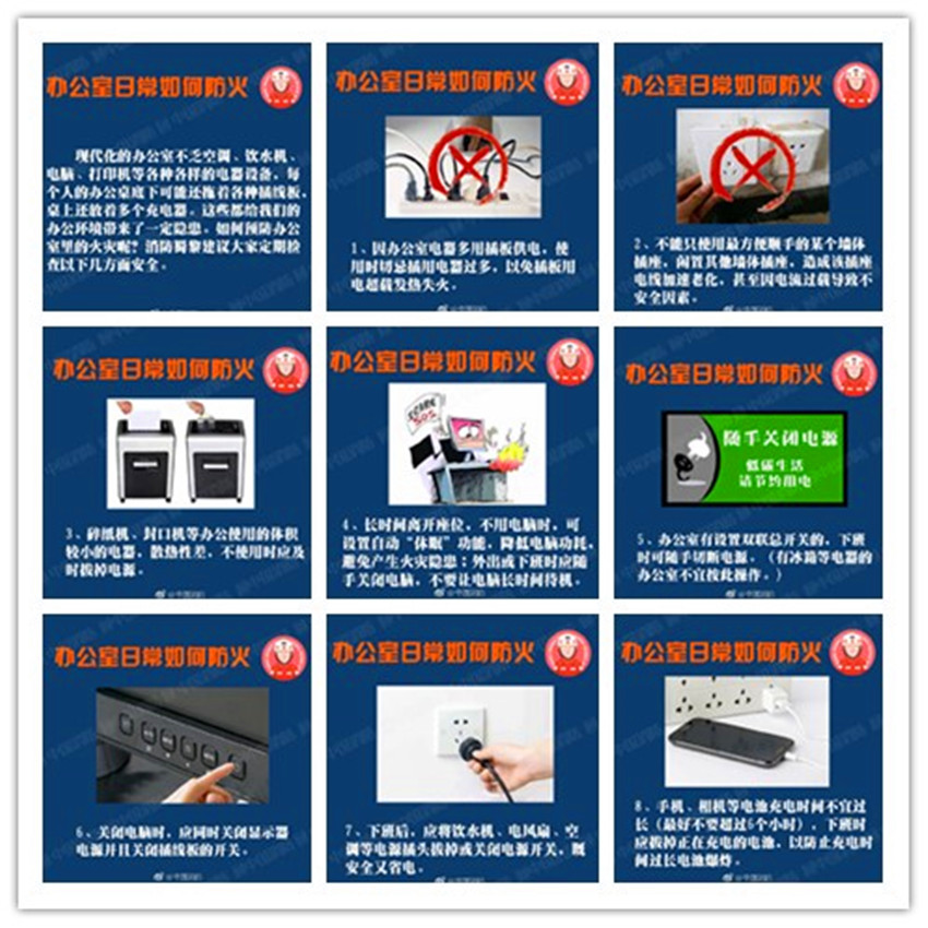 对于办公室上班族来说,大多数时间都在办公室度过,现代化的办公室不乏空调、电脑、饮水机、打印机等各种各样的电器设备,每个人的办公桌下面电器设备较多,防火安全不可大意。掌握以下几点消防常识,让你的办公室更安全!