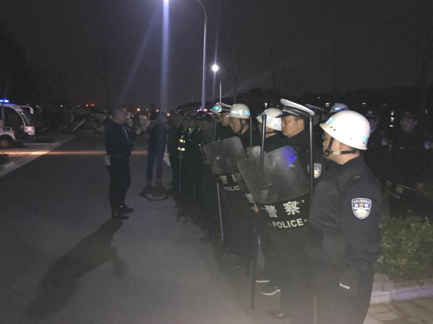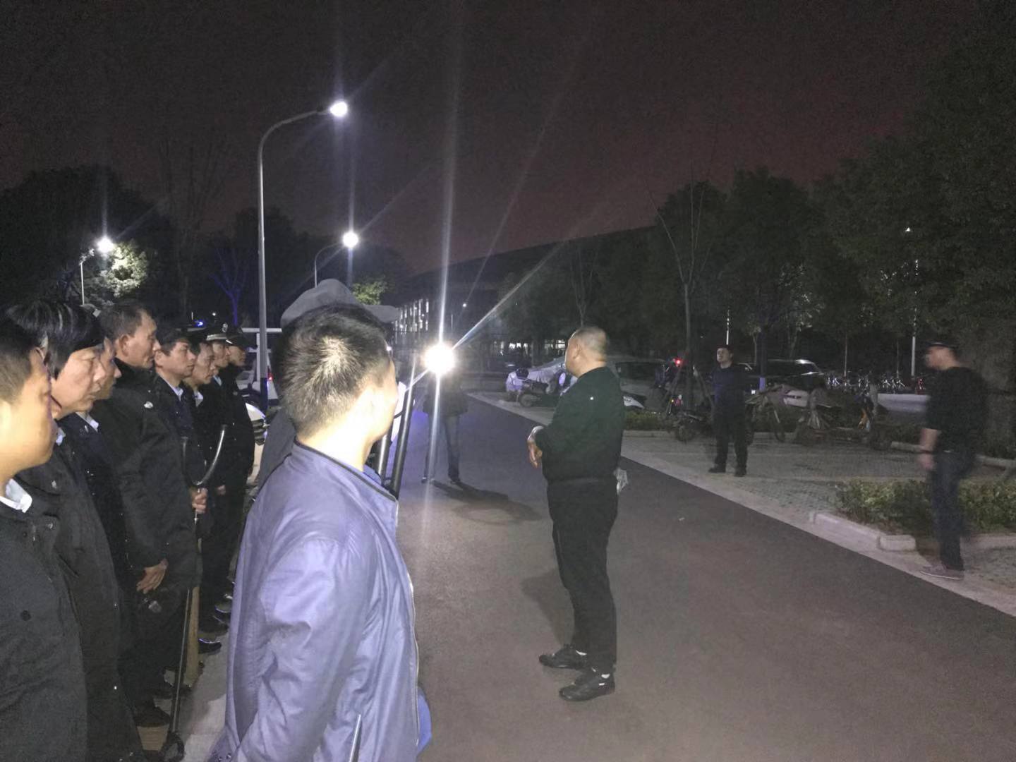 2019年3月20日20:35分,“校园110监控指挥中心”值班员的警情呼叫:“北区艺术与传媒学院附近有一男子,约四十岁左右,着黑色上衣,灰色牛仔裤,黑皮鞋,手中可能持管制刀具,有暴力行凶倾向,校区所有的巡逻安保队员立即赶往现场,对嫌疑人实施围捕,确保师生安全”,保卫处组织的校园应急反恐防暴演练工作正式开始。接警后,校区所有安保队员都穿带好各自的防暴装备,快速赶赴现场,根据叙述的“嫌疑人”基本特征,展开搜索、排查和抓捕目标的工作,同时对外围道路实施警戒,疏散附近围观人群,确保抓捕工作顺利开展,演练于20:40分结束。