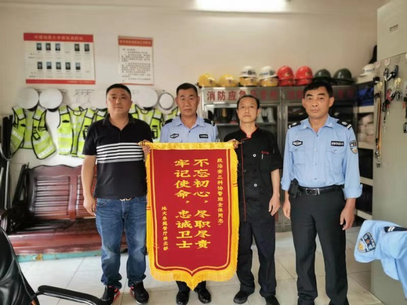 10月8日下午,东苑食堂西北美食窗口席红波到治安三科协警班,感谢东区管理班队员2次将其电动车钥匙捡到后妥善保管,并向队员送锦旗表示谢意,赞扬保卫队员认真负责,不忘初心,敬职敬责的工作精神。