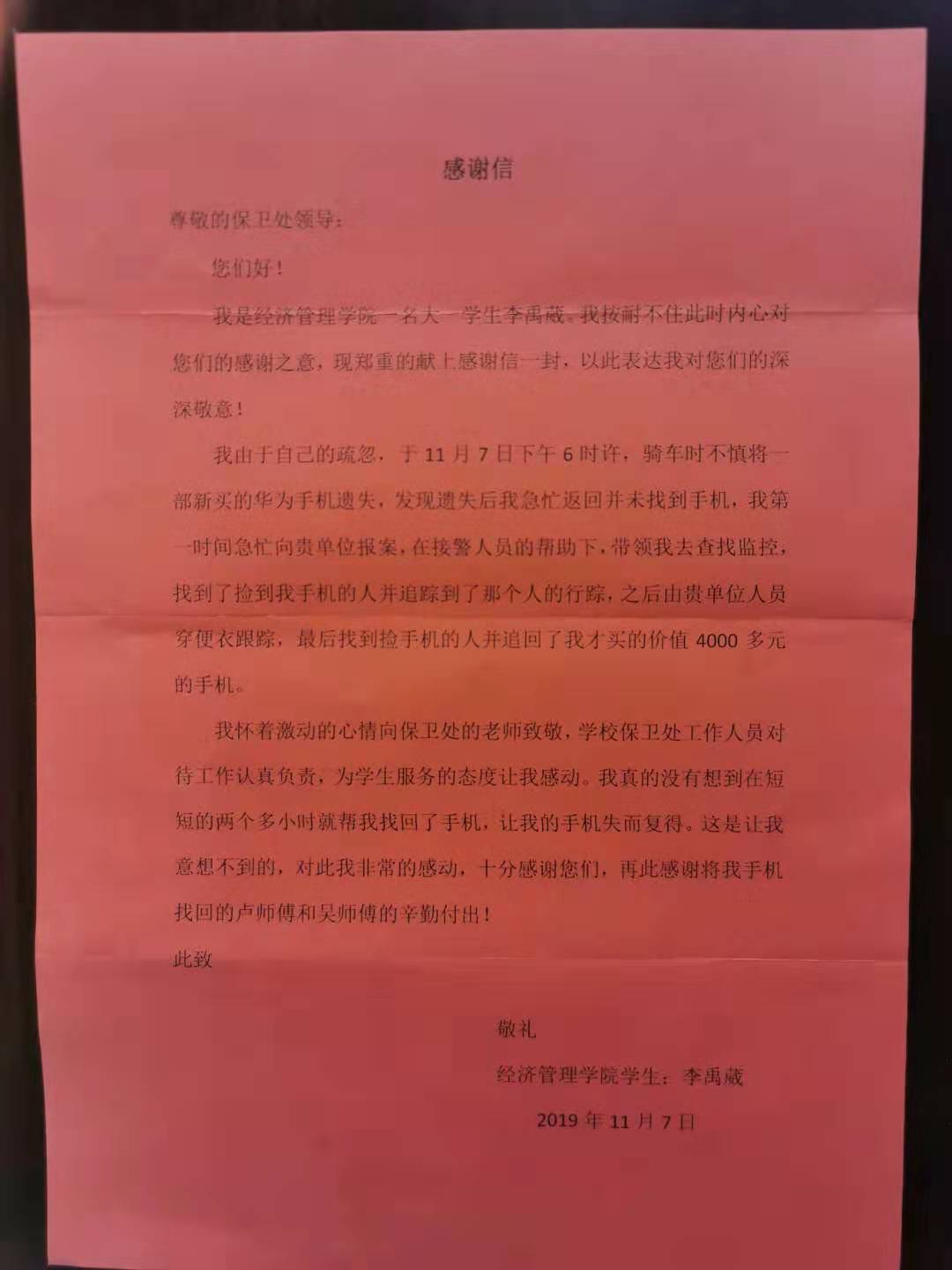 2019年11月8日,经济管理学院李同学将一封感谢信送到保卫处治安二科杨中秋手上,感谢他及时帮助其追回遗失的手机。