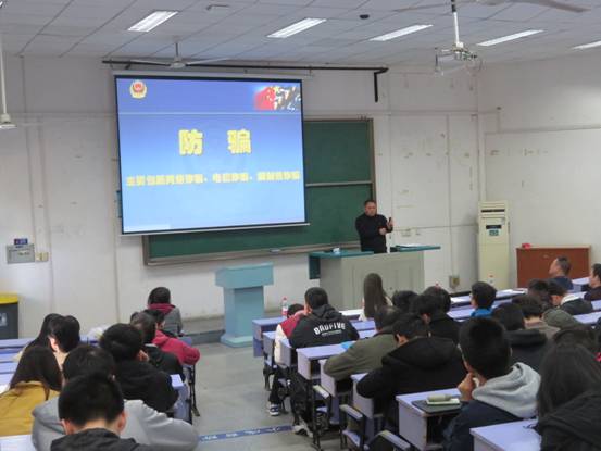 保卫处对在校学生的安全教育非常重视,此次安排单红峰副处长,消防科周日恒等同志进行授课。单红峰同志以大量发生在身边的案例,首先讲述了学生宿舍和公共场所防盗,以及人员密集场所的自我防范等防盗知识。针对近期网络诈骗案件高发的特点,单副处长又从诈骗案件发生的社会环境,诈骗案件的类型及防范措施等几个方面,教导同学们不要贪图小便宜,明辨骗子的诈骗手段,凡涉及银行卡、公检法、安全账户、中奖等内容的电话一律不接,保障自己的财产安全。消防科周日恒同志则就现代火灾的特点,使用违章电器的危害等方面,希望同学们注意用电安全,遵守学校的规章制度。