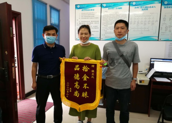 近日,校内教工吴女士来到保卫处秩序科,将一面“拾金不昧 品德高尚”的锦旗送给西一门门禁班,并对门禁班拾金不昧的队员表示感谢! 2020年8月16日,吴女士的家人将含有大量现金、银行卡以及众多证件的手提包遗失。在门禁队员的大力协助下,及时联系到其家人杨先生,将其遗失的手提包交还。此前,门禁队员曾多次拾得校内师生及附近居民遗失的手机、钱包等,均及时查找失主,将钱物送归原主。