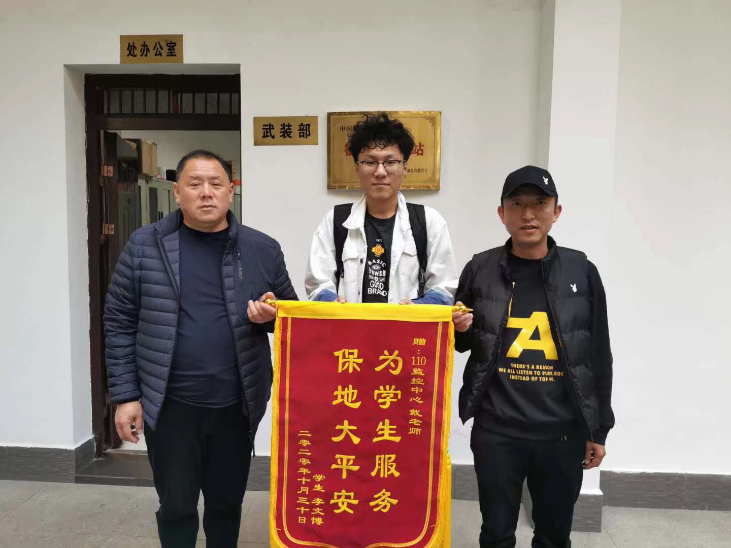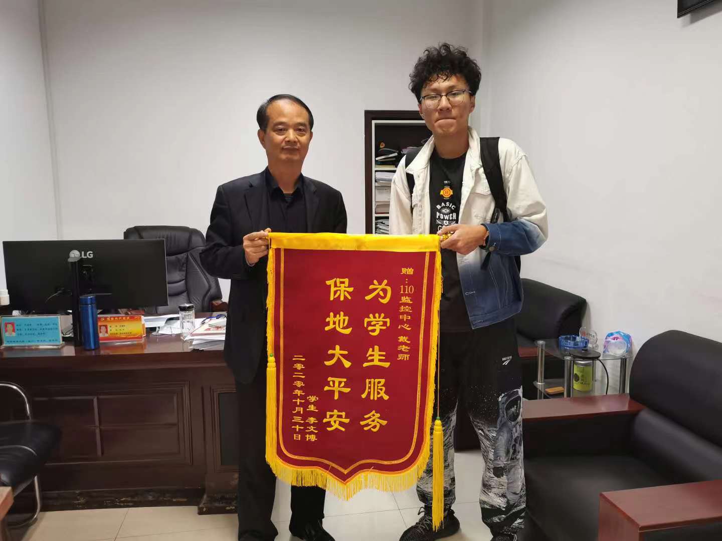 此时离事发时间过长,无法查看到当日监控,监控中心主任戴云安得知此事后,安慰李文博同学,并答应他会尽力帮他寻找手表。凭着长期查案的经验,他想到目前校园封控管理,被校外人员盗窃的可能性不大,于是向多部门多渠道了解情况,经过两天的摸排查找,最终找到拾取手表的人员。10月26日,经过现场确认并归还同学遗失的手表.李文博同学高度赞扬戴老师这种为学生服务的态度和责任心,11月9日送上锦旗一面,对保卫处人员的这种工作精神表示由衷地感谢!