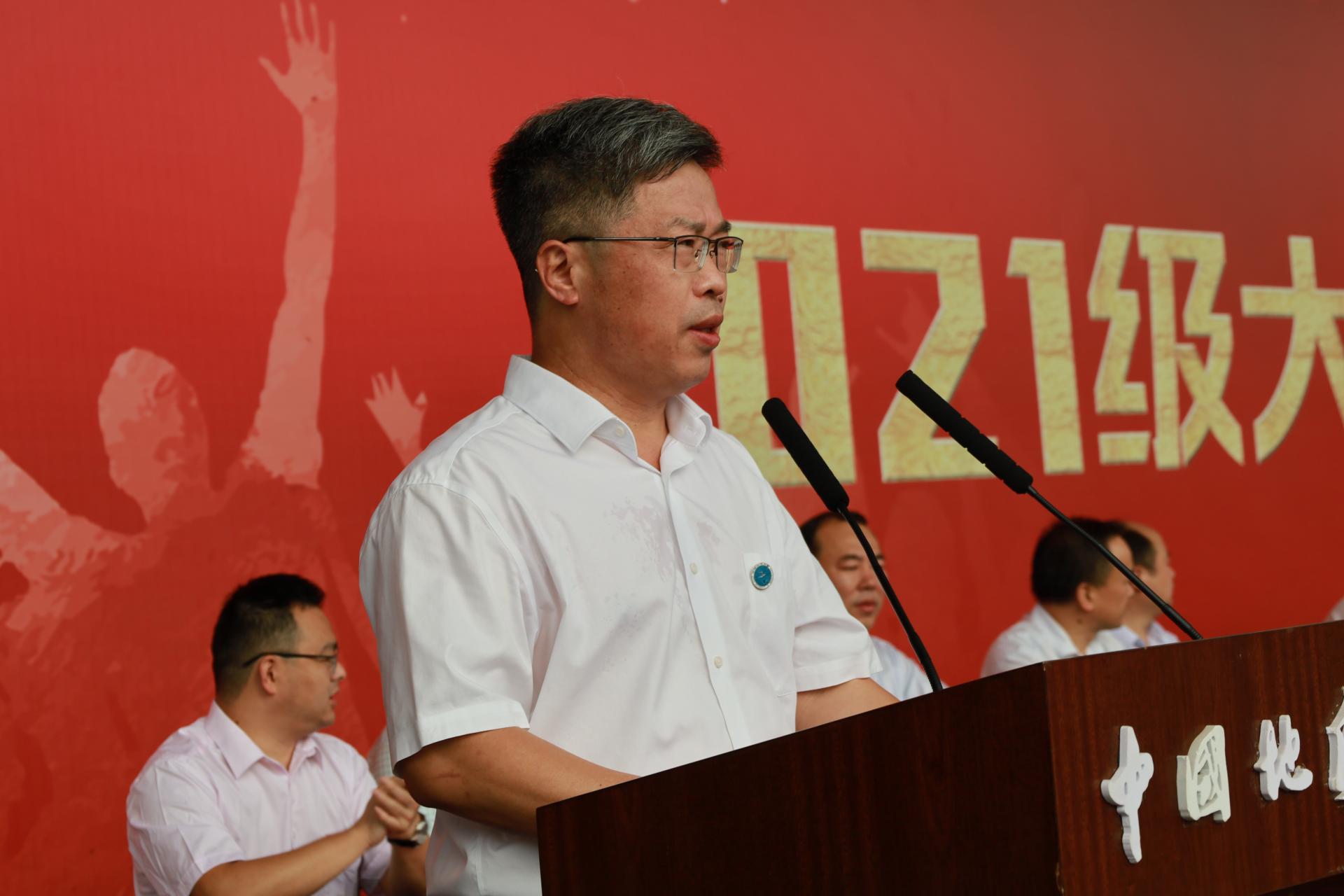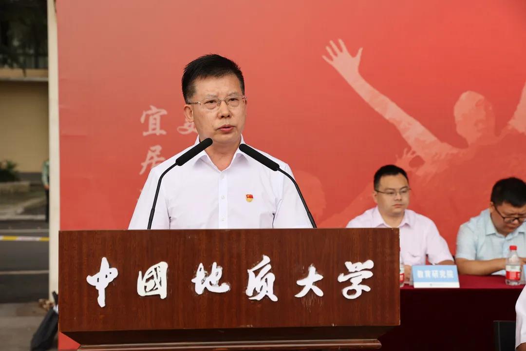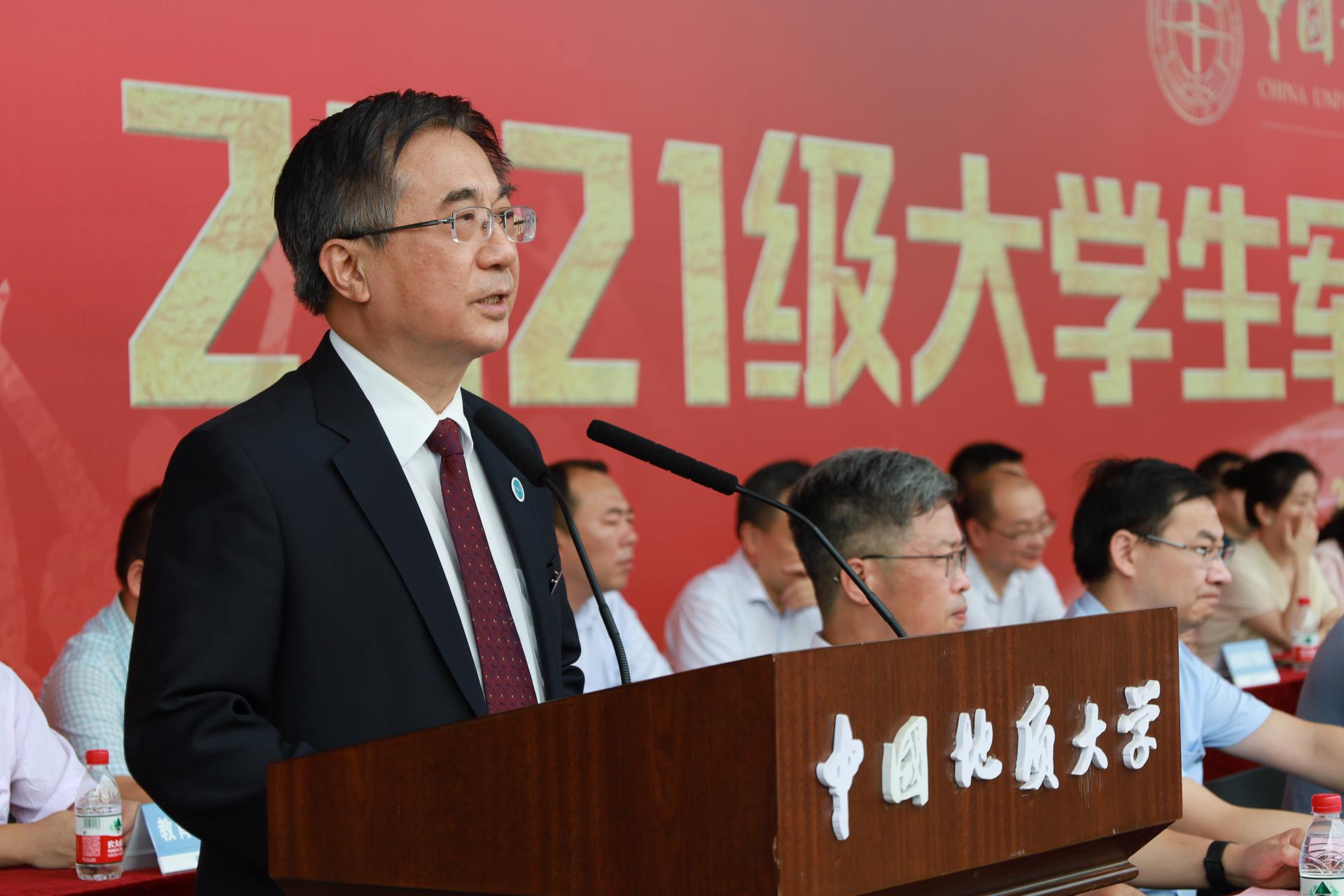 王焰新校长作题为《胸怀天下 问学求新》的讲话。他向新生们介绍了学校的发展历程。他说,地大自诞生之日起就将自身的发展融入党和国家发展大势,始终坚守为党育人、为国育才的初心,传承锐意创新、勇攀高峰的气概,书写了一代代地大人爱国、奉献、求真、担当的华彩篇章,接过奋斗接力棒的2021级新生们要胸怀天下、立青云志,问学求新、做追梦人,成为新时代出彩的“CUGERS”,交出令人满意的答卷。他表示,胸怀大志就是要始终怀揣爱国的赤子之心、砥砺践行共同体理念,接力擎起“一心爱国、奋斗一生”的旗帜,传承“艰苦朴素、求真务实”的校训精神,变“求知”为“求道”,把个人发展融入世界整体、地球健康、人类安全,在地大构建放眼天地的大时空观、沧海桑田的大历史观、知行合一的大实践观,在大变局中找准定位,在大格局中担当奋进。问学求新就是要潜心探索、孜孜以求,厚植基础、追求卓越,他希望同学们不要通过搜搜头条、晒晒票圈、刷刷抖音来快速地获取信息,要传承和弘扬向学、乐学之风,以谦逊之态度、探索之精神,在美丽的地大校园里静下心来,在课堂上抬起头来、举起手来、提出问题来,拜真师、求真知、塑真我。最后希望新生们认识地大、了解地大、融入地大、成就地大,与家国同心、与时代同向、与正念为伴,在高山大海上抒写豪情壮志,在日月星辰下反躬自省,在艰难困苦中玉汝于成,做爱国者、奋斗者、攀登者,在为祖国和人民奋斗中书写青春的灿烂篇章。