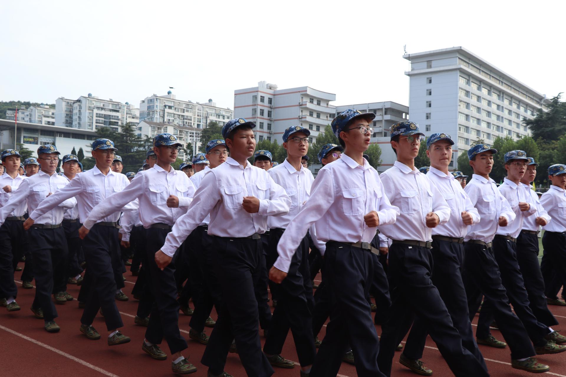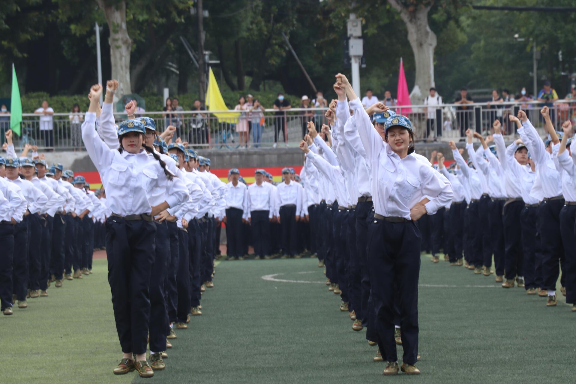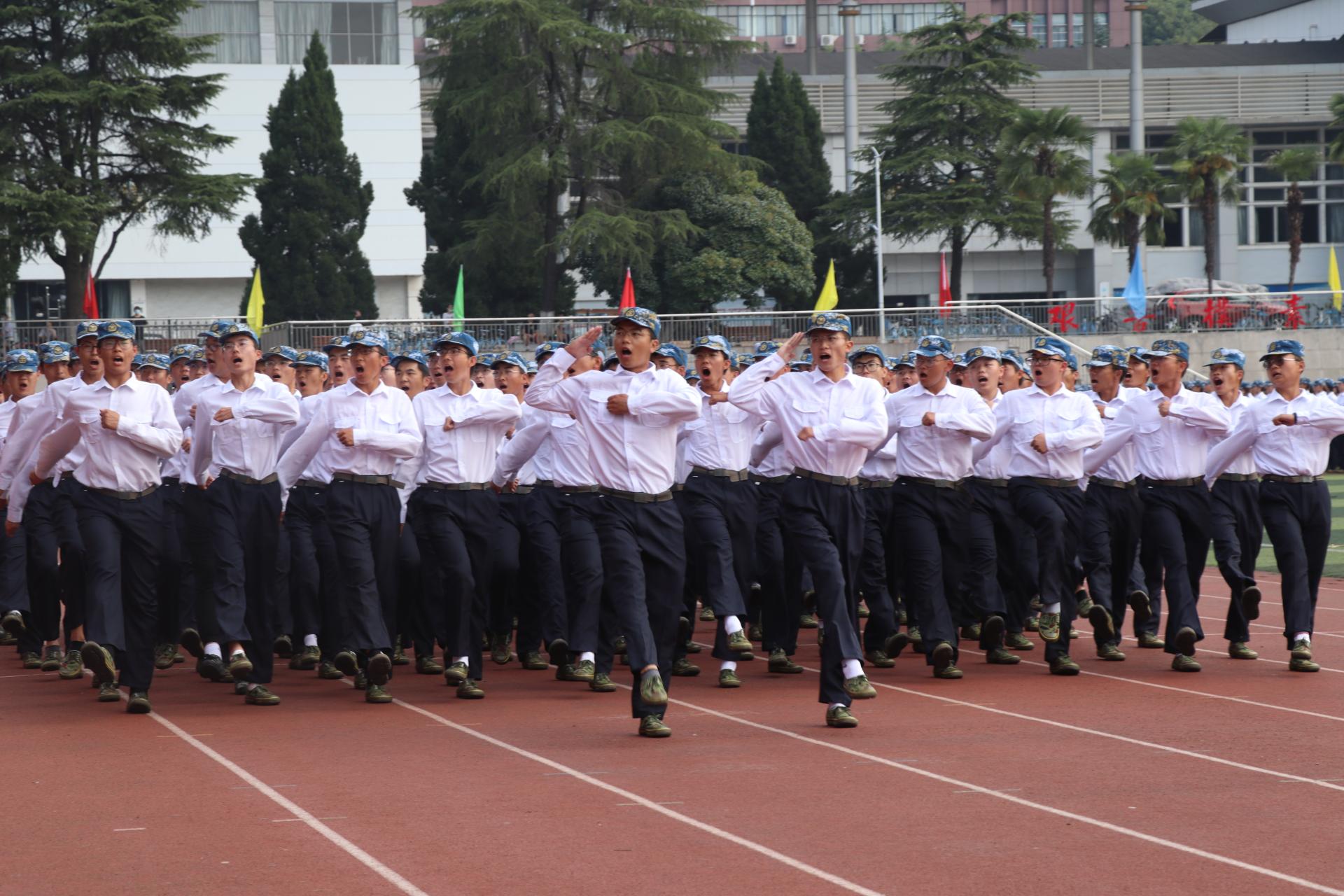 新生们以饱满的精神、挺拔的军姿、整齐的正步和洪亮的口号,依次走过主席台前接受检阅。