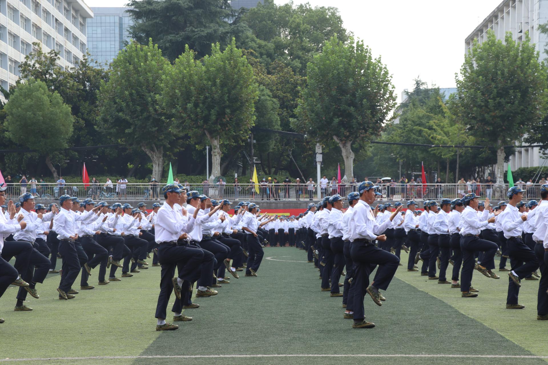 由各学院新生组成的千人方阵分别进行军体拳和团体操表演,他们的动作干净利落、口号掷地有声,展现了大学生积极向上、热情洋溢的青春风采。