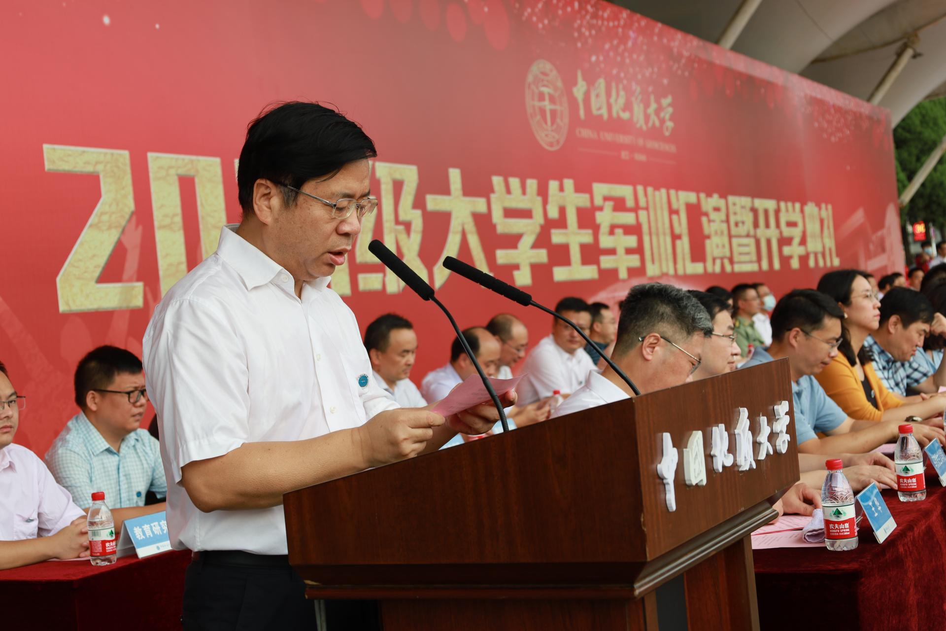 9月24日上午,我校2021级大学生军训汇演暨开学典礼在南望山校区西区操场举行。中国科学院院士殷鸿福,校领导黄晓玫、王焰新、成金华、唐辉明、赖旭龙、王华、王林清、刘杰、周爱国,武昌职业学院党委书记王大耀、校长助理王宇,学校各学院、管理与服务部门负责人,学工系统干部教师,学生代表,以及2021级4796名新生参加典礼。典礼同步在长江日报官方平台、斗鱼、今日头条西瓜视频、哔哩哔哩、抖音、新浪微博、微信视频号进行直播,线上观看人数超过15万人次。