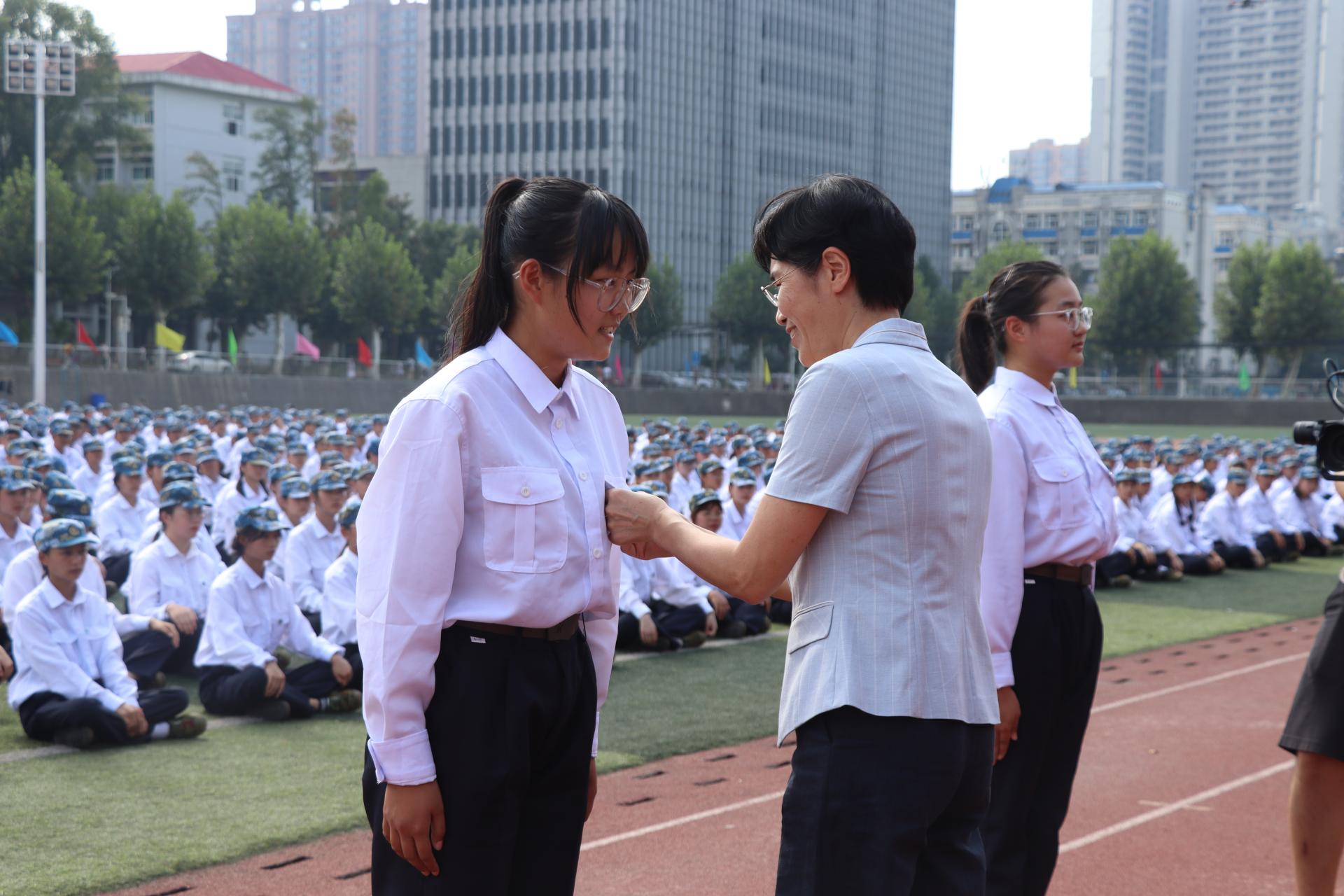 校党委书记黄晓玫为新生代表佩戴校徽。