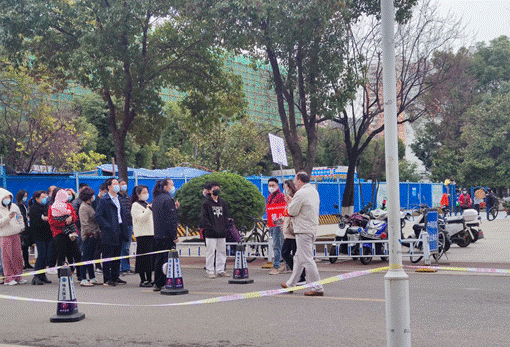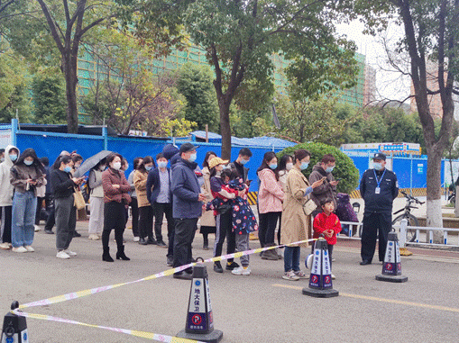 鉴于校园内核酸检测人数众多,为保障核酸检测的秩序,在每个核酸检测采样点,都活跃着安保人员以及志愿者们忙碌的身影。