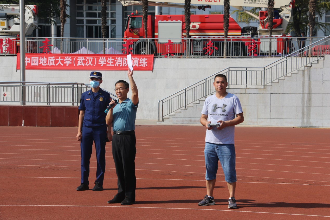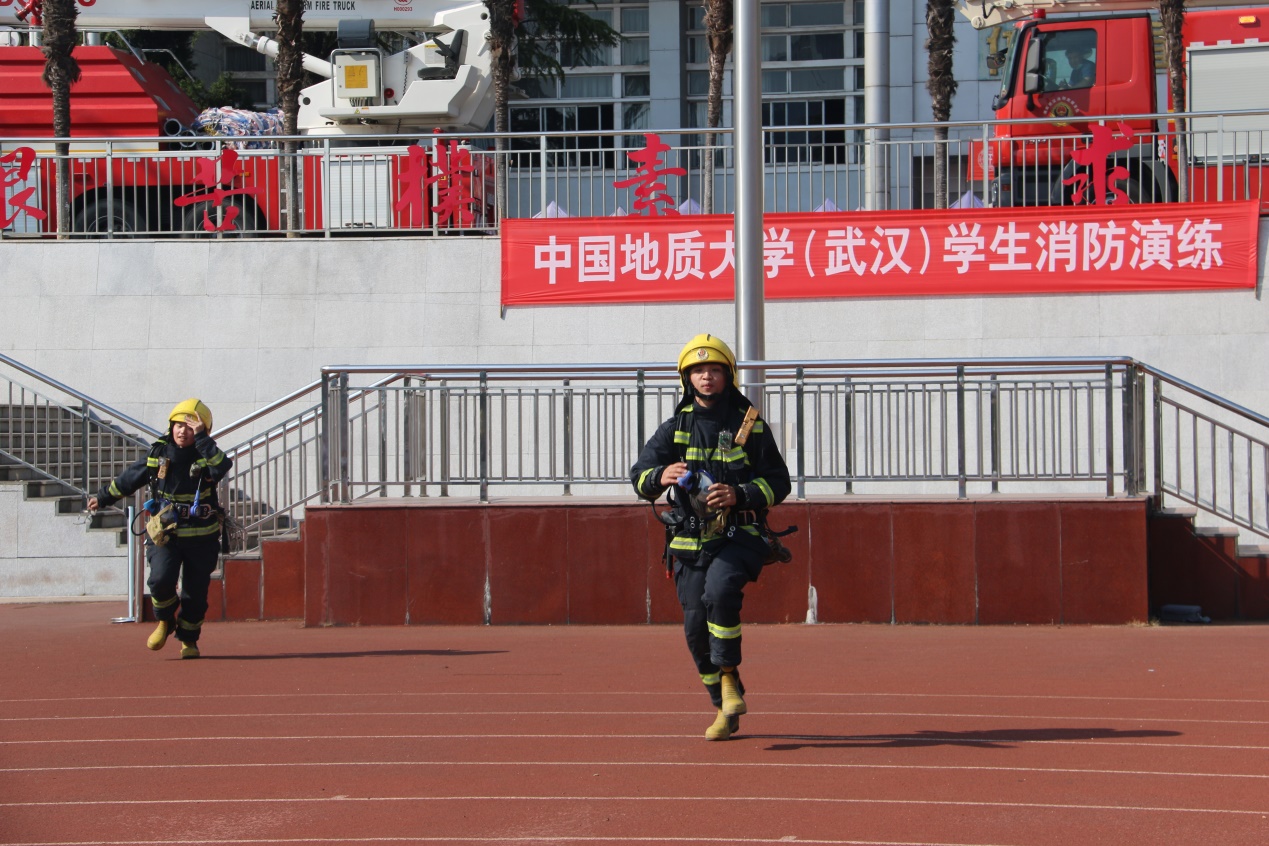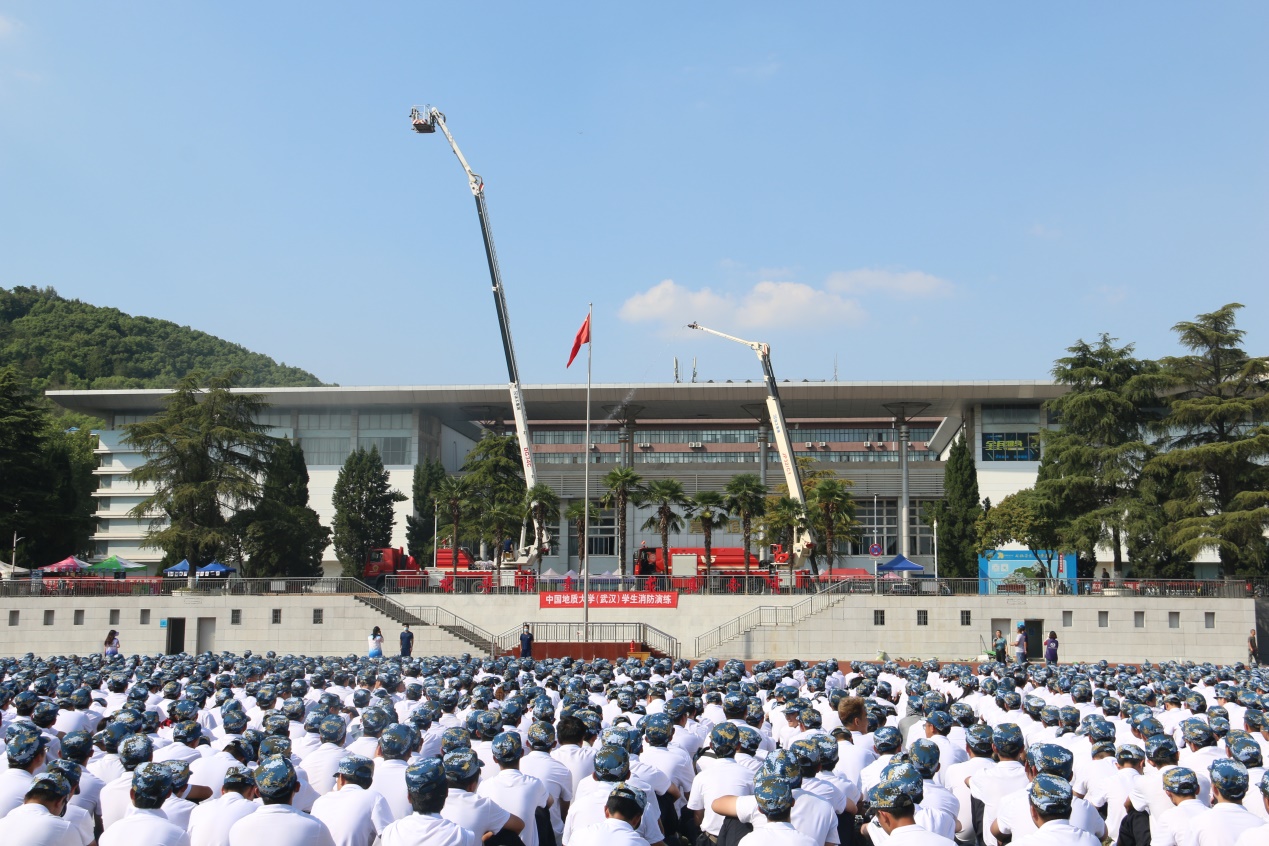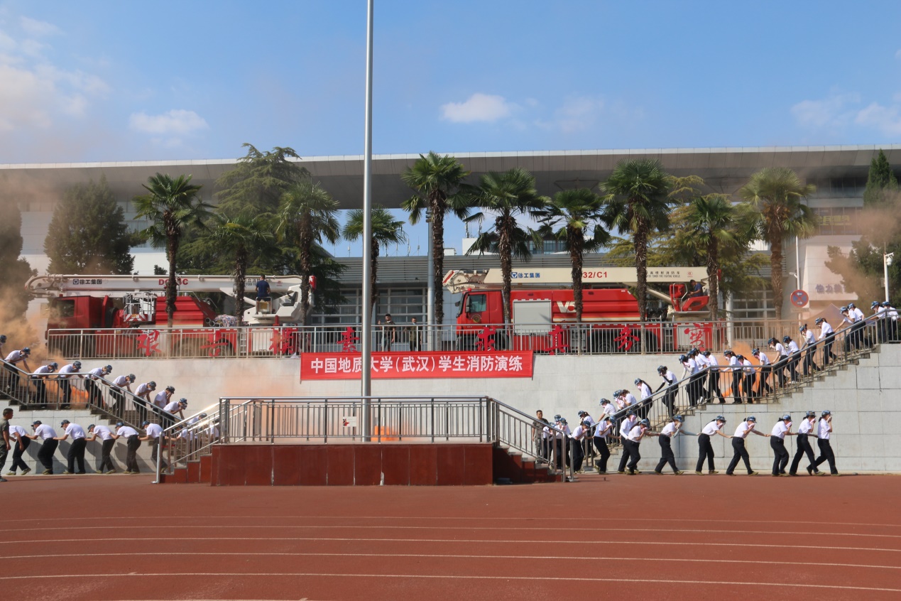 下午三点,安全保卫部郭敬印副部长宣布消防演练正式开始。随即,烟雾弹拉响,80名新生用湿毛巾捂住口鼻,低姿从操场两侧屈身模拟逃生。同时消防高空救援车和高空喷水灭火车也缓缓升起,进行现场展示。