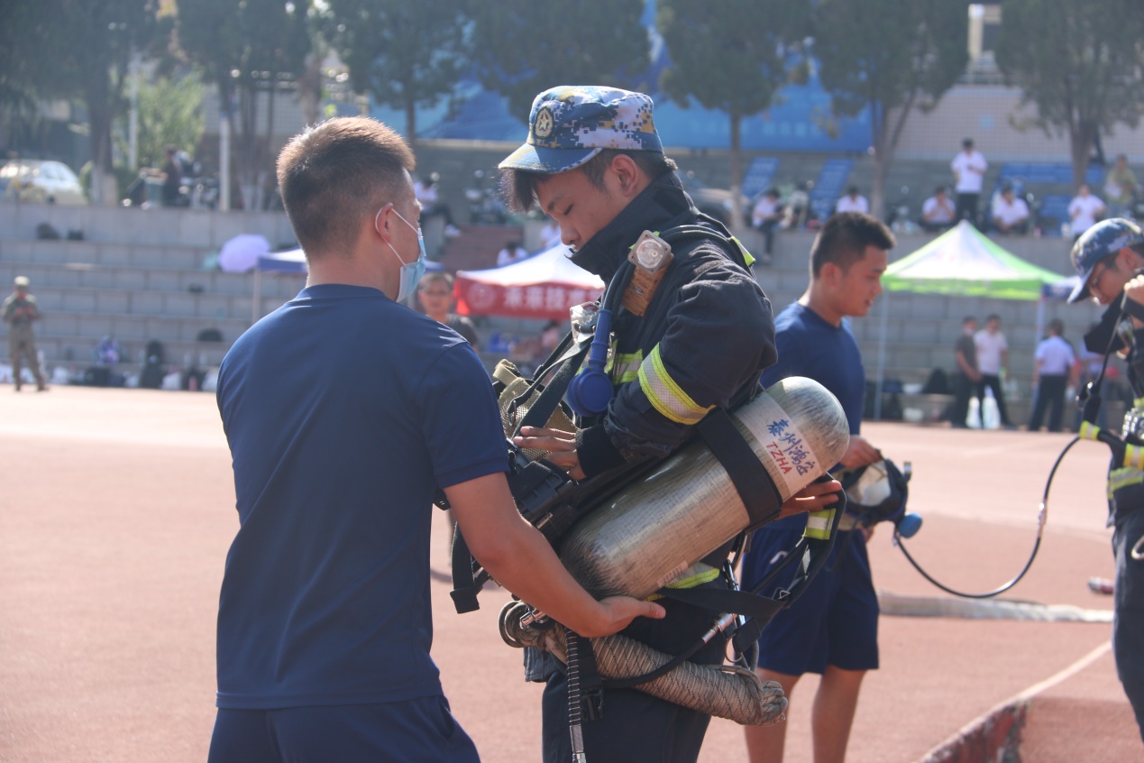 消防救援官兵为新生们普及基本消防安全知识,讲解并演示了消火栓水带的使用及消防作战服的穿戴方法。随后,安全保卫部消防科刘从贵科长讲解灭火器使用方法。