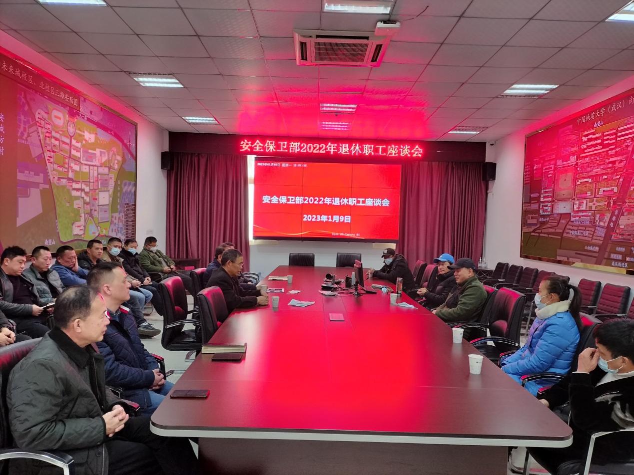 (通讯员:魏刚、许微)1月9日下午,安全保卫部召开了2022年退休职工座谈会。2022年荣休的五位同志分别是:刘汉、王新建、李精、魏益明、李明。会上,代清风部长代表组织对5位荣休同志几十年辛勤工作给予了充分肯定和感谢,为他们送上了新春的祝福和慰问,希望大家退休后一如既往地关心和支持安全保卫部工作,常回“家”看看,多沟通交流,有什么困难,安全保卫部一定全力帮助。同时,要求与会在职的干部同志,弘扬安全保卫的优良传统,关心退休老同志的生活,为退休同志提供热情、周到的帮助和服务。五位荣休同志分别发表了感言,回忆了在保卫部的工作时光,对学校安全保卫事业的发展进步感到自豪,感谢大家的帮助和支持,希望在座的同志在班子领导的带领下,将保卫事业做得更好!这次座谈会增强退休职工的归属感,体现人文关怀。安全保卫部领导班子、各科室科级干部,部门教职工代表参加了座谈会。会后,与会人员合影留念,并向退休同志发放了《安全保卫工作七十年》纪念册。