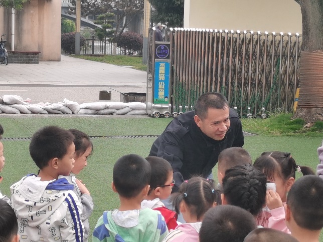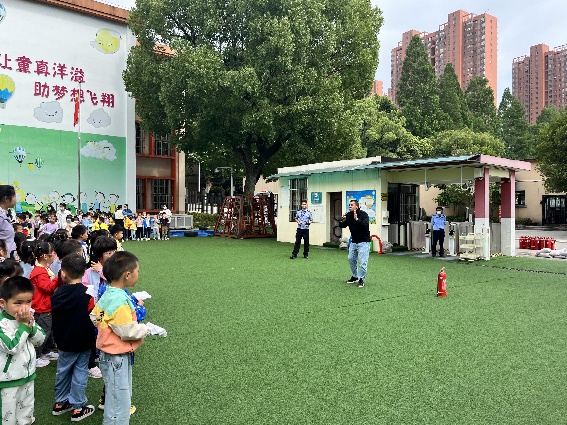 演练完毕后,消防科刘从贵科长针对幼儿年龄小,好奇心强等特点,通过动作示范的方式介绍消防逃生要领、灭火器使用方法、灾害发生的原因,学会简单安全防护、自救互救措施的正确方法。