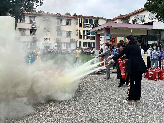 最后,全体老师和职工进行灭火器灭火实操的练习,小朋友们也观看了灭火的全过程。