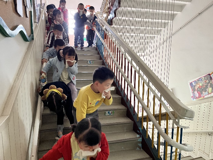 下午15:00时,模拟逃生疏散演练开始。随着警报声响起,各班的老师迅速指导小朋友们,双手用湿毛巾捂住口鼻,弯腰沿着安全楼梯快速有序撤离,到达室外的安全地带后,各班负责老师马上清点人数并汇报人员撤离是否安全。整个逃生疏散演练做到紧张、安全、有序,达到了预期的演练效果。