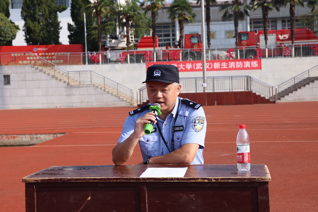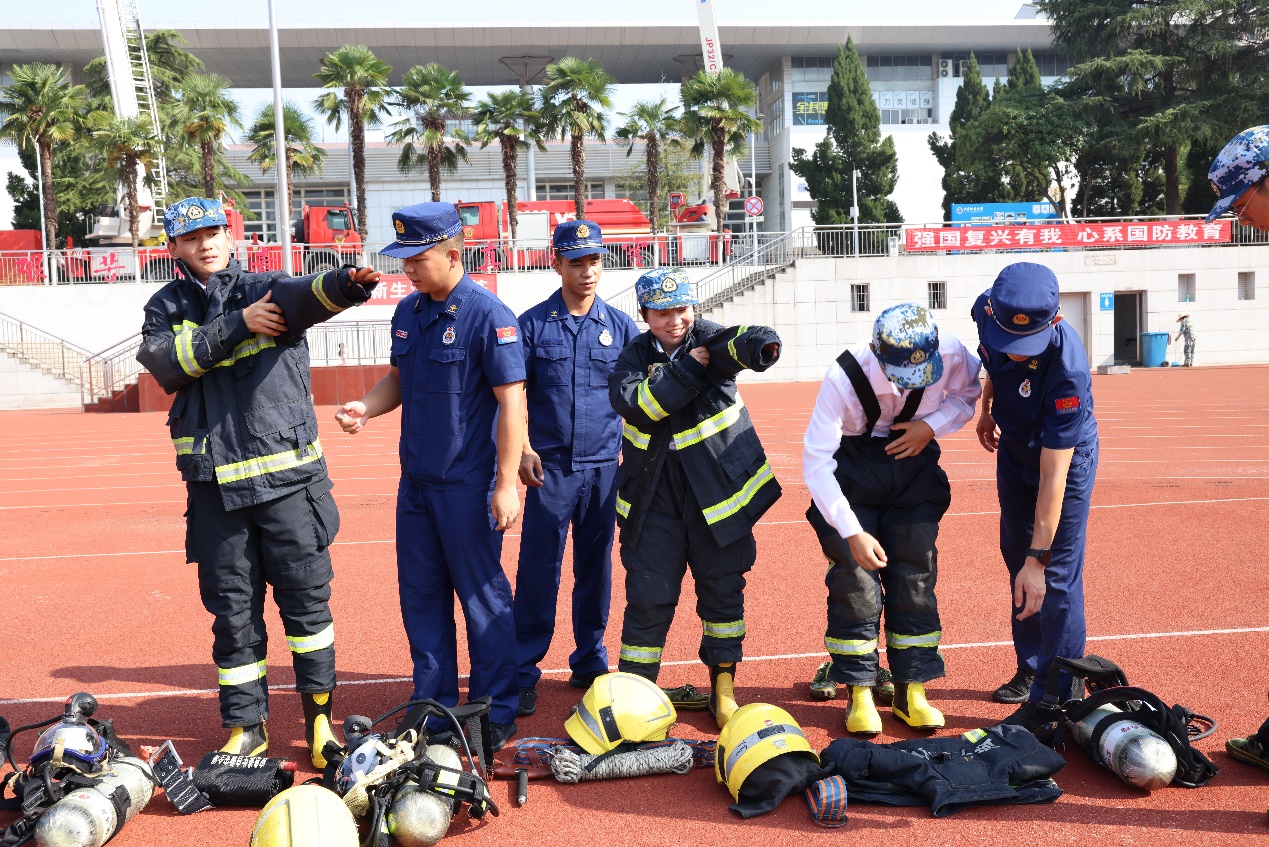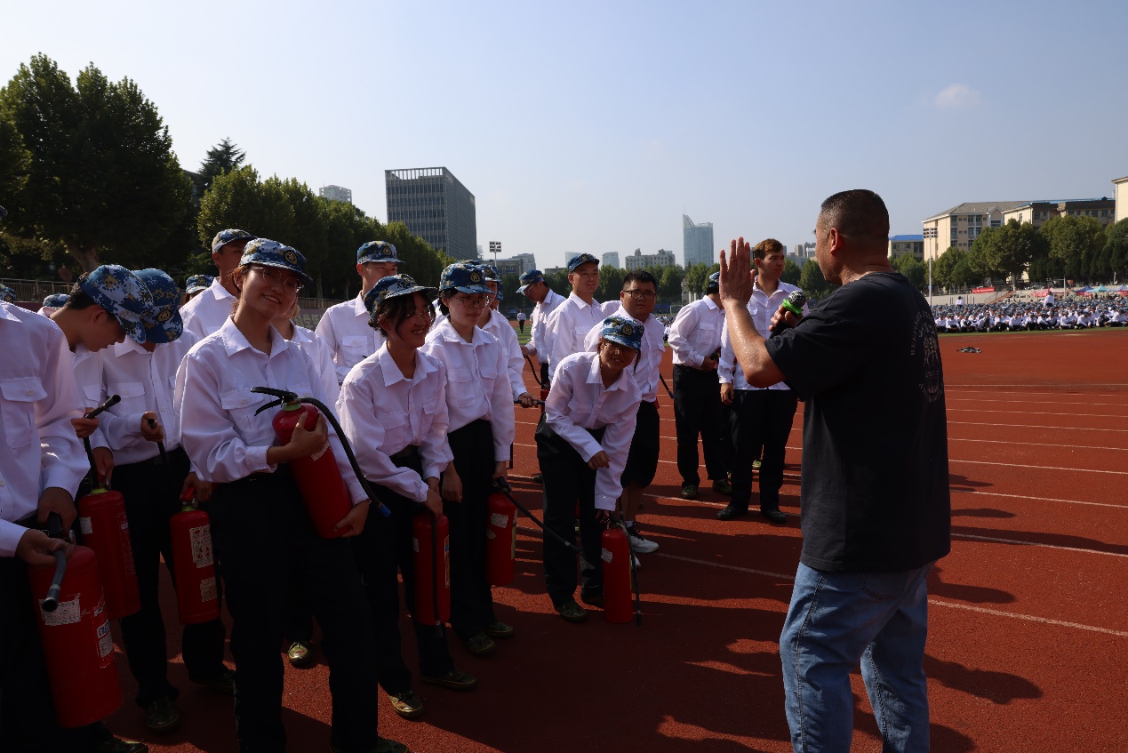 为了增强学生消防安全意识,培养新生在突发性灾害发生时,能熟练掌握有关防火和逃生的知识技能,安全保卫部邀请关山消防救援站官兵、消防科科长刘从贵分别讲解示范了消防设备的穿戴使用方法、灭火器的使用方法等。