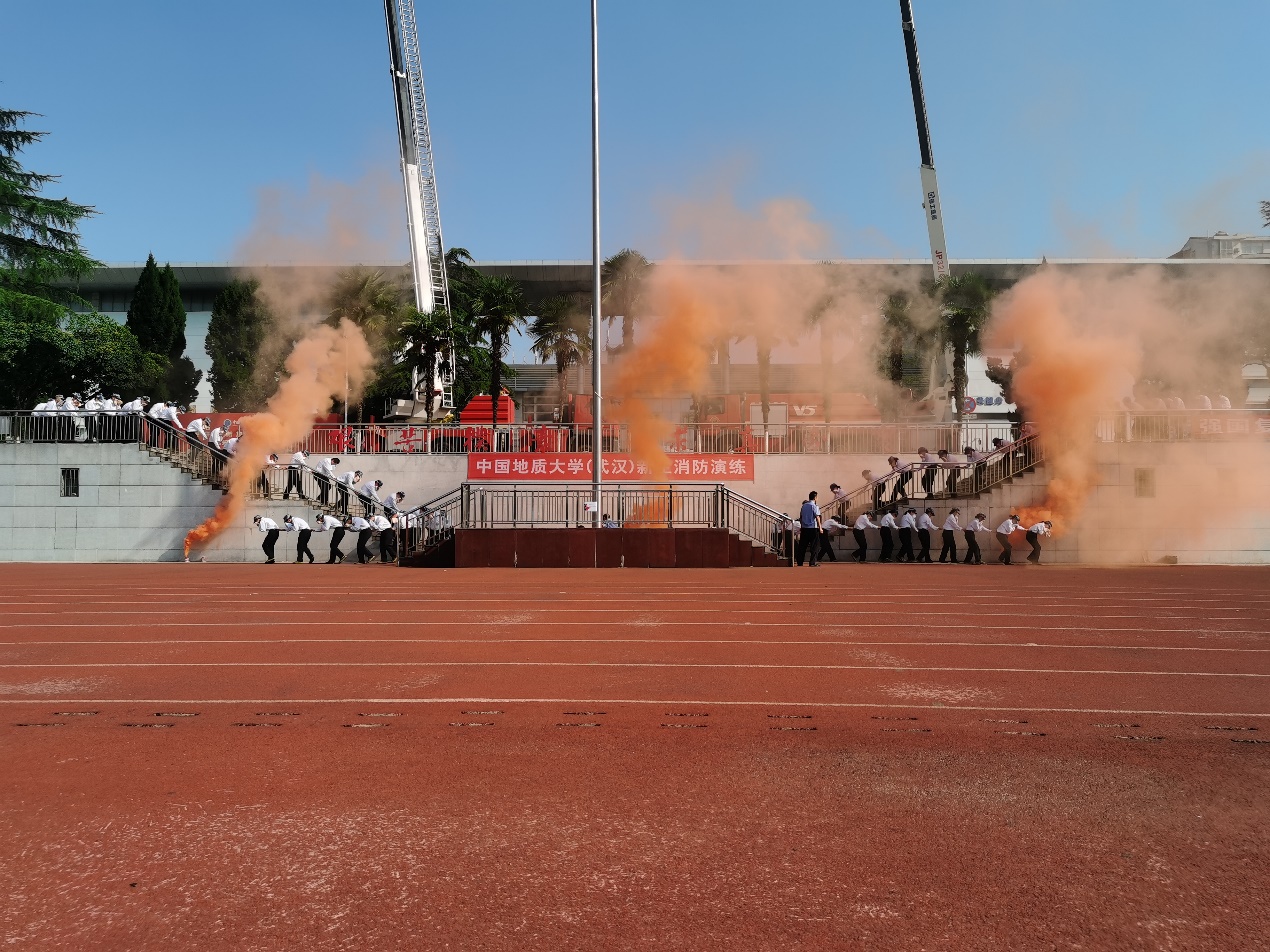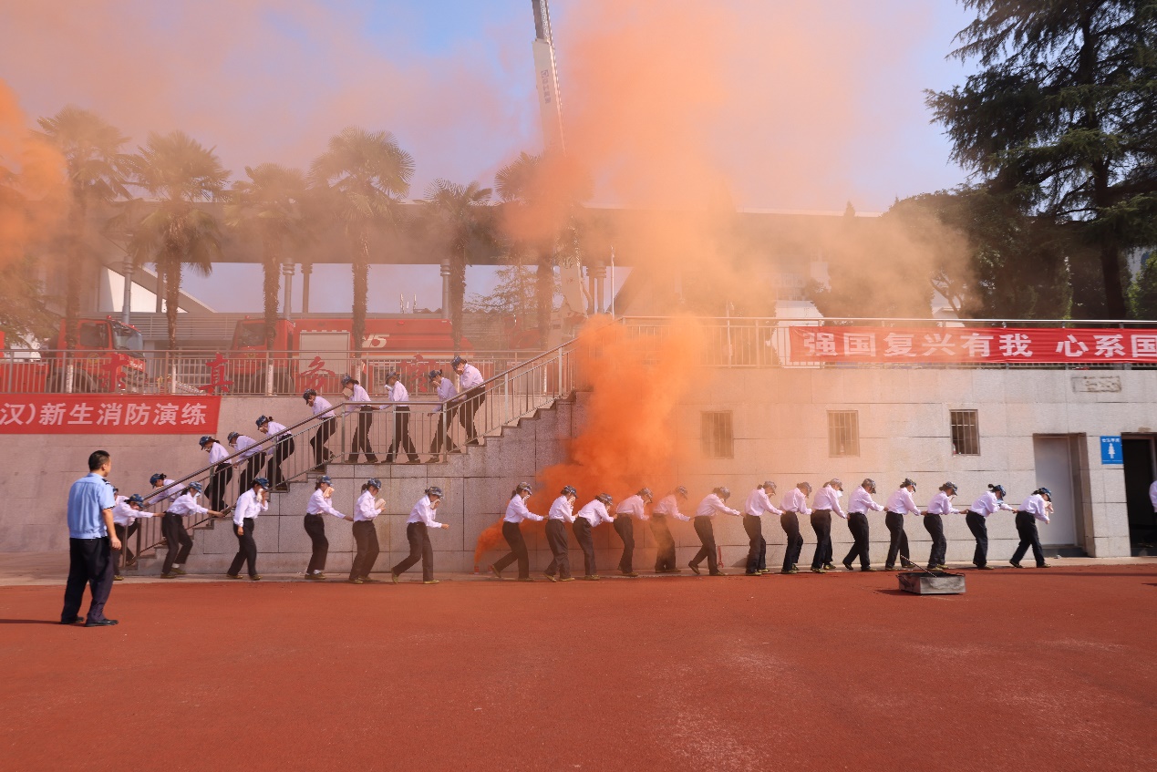 紧接着,进行了消防安全教育。随着烟雾弹拉响,顿时浓烟滚滚,60名新生用湿毛巾捂住口鼻,低姿从操场两侧屈身,穿越烟雾区模拟逃生。同时消防高空救援车和高空喷水灭火车也缓缓升起,现场进行消防和救援展示。