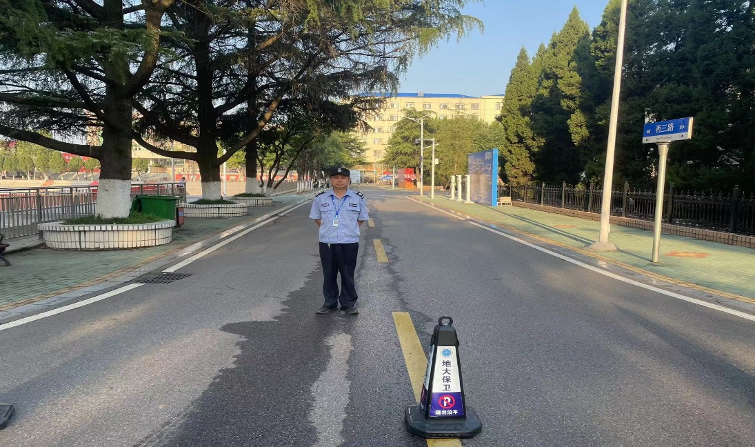 安保部治安科(西区)队员坚守一线岗位,维护军训汇演交通秩序