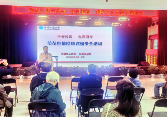 (通讯员:彭红进)为进一步提高离退休教职工的安全防范意识和能力,消除日常生活中受骗、火灾等安全隐患。10月12日下午,安全保卫部彭冠军副部长和治安科负责同志应邀到离退休活动中心,为离退休老同志开展安全知识专题宣讲。宣讲会由离退休干部处刘国华处长主持。