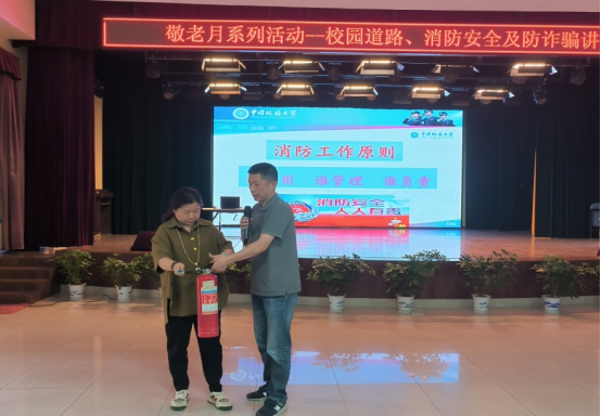 彭冠军介绍了目前学校安全警情和面临的安全形势,列举发生在老年人身边的典型案例,分析了当下老年人容易上当受骗的类型和原因,详细讲解了防范电信网络诈骗的措施和方法;重点介绍了老年人室内易发火灾成因,强调逃生要领、灭火方法,提示了正确校内救助报警方式。治安科负责人就如何正确使用灭火器材进行现场指导和演示。