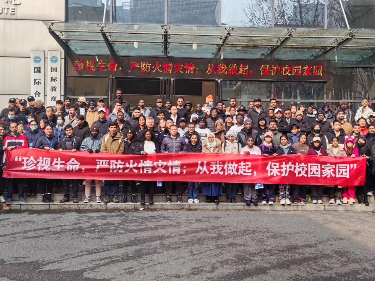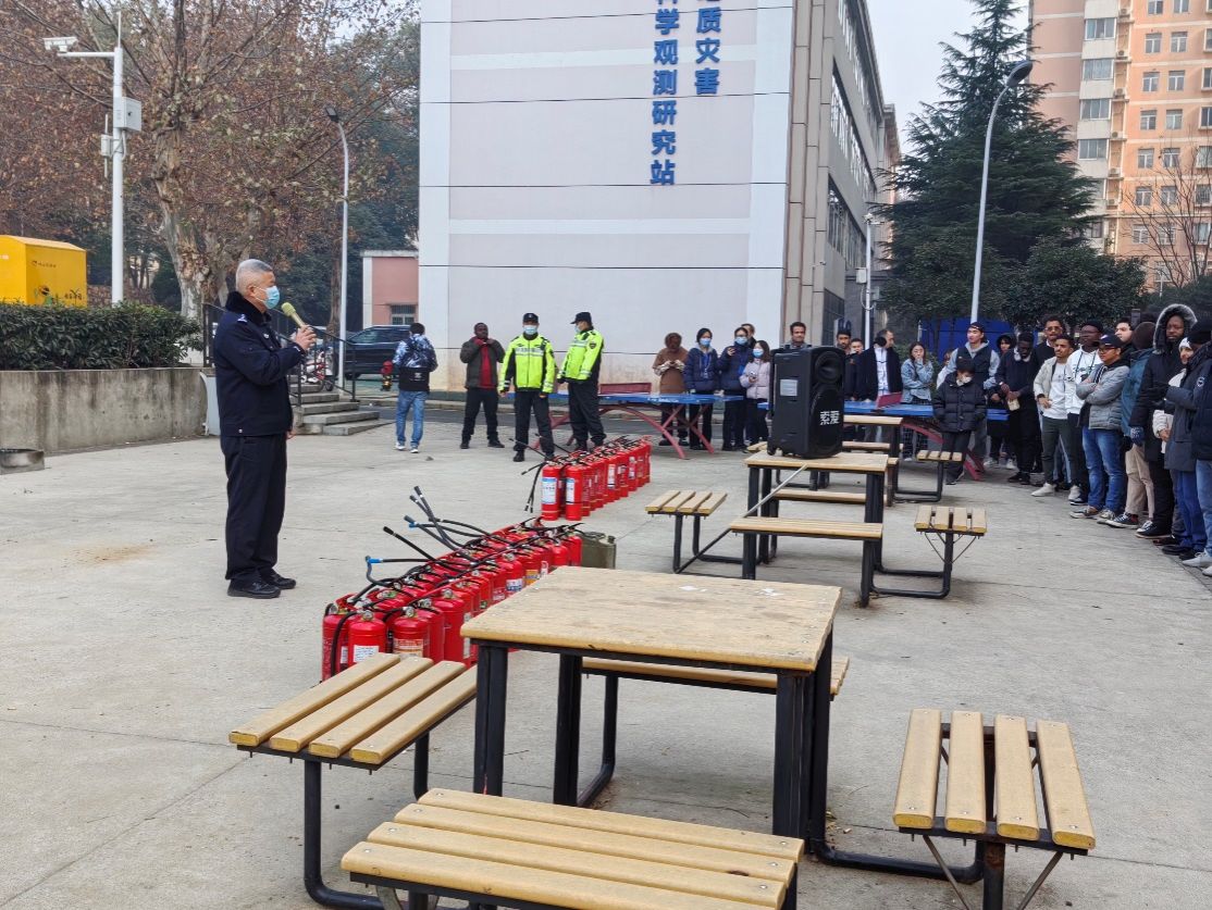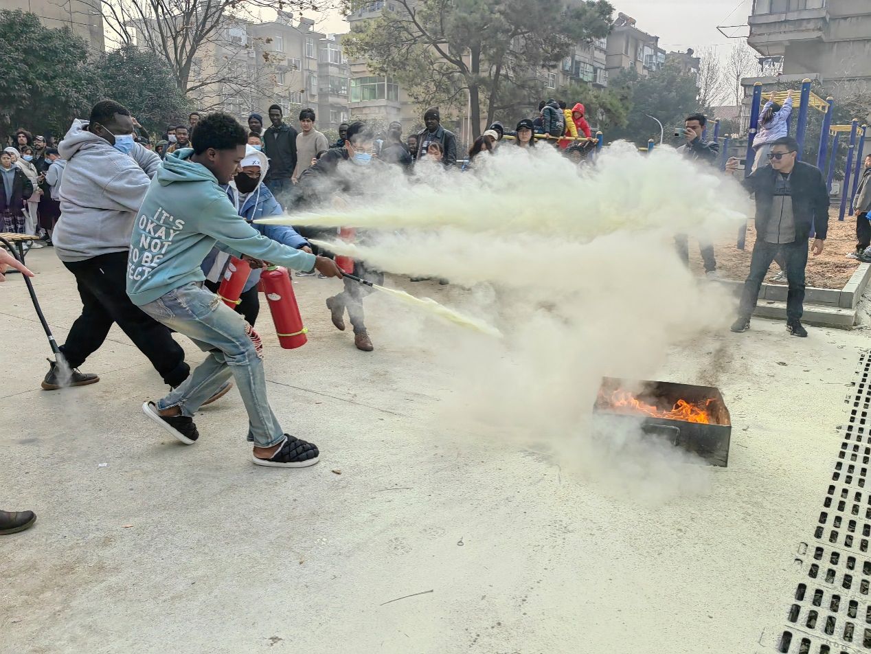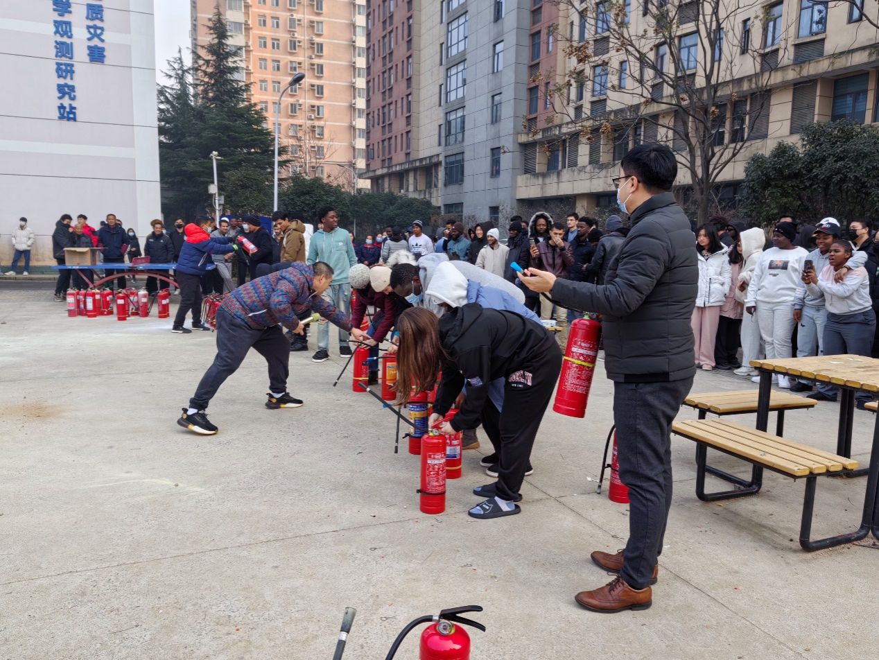 为增强学校留学生的消防安全意识,掌握应急逃生技能, 2023年12月28日下午,国际教育学院、安全保卫部联合喻家山派出所一起在“丹桂苑”留学生公寓,精心组织了一次消防疏散逃生演习与灭火器实操演练活动。楼内400余名在校留学生参加了此次活动。