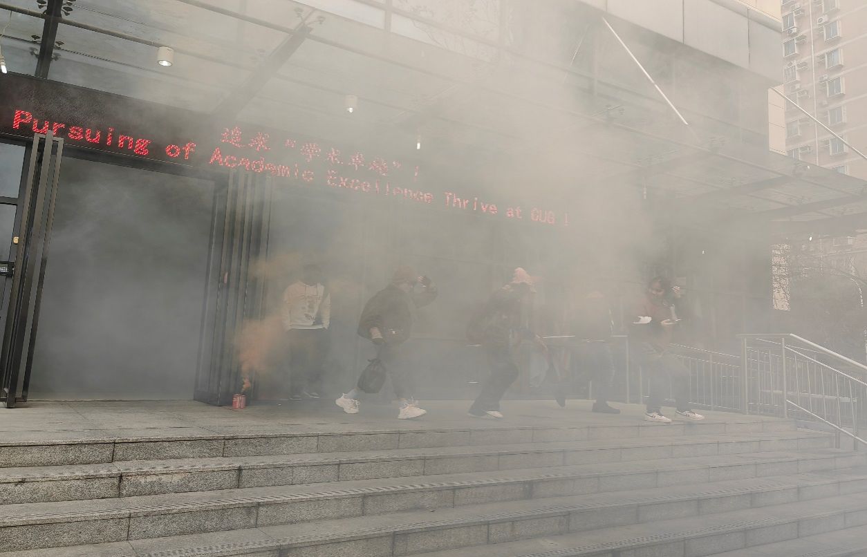 疏散逃生演练于下午13时正式开始。指挥员一声令下,拉响烟雾弹,顿时楼内浓烟滚滚,楼内火灾报警器随即响起,消防监控值班室通过楼内消防广播,也用中英法三种语言,循环播放疏散通知和疏散逃生的要领,楼内各个应急小组迅速引导留学生疏散逃生;安全员值守在电梯厅,防止疏散人群使用电梯;楼层引导员在紧急出口处为疏散人群指引方向;楼外警戒员将撤出人群引导到楼外指定位置。为确保楼内的每一位留学生都已经撤离;楼层工作人员逐一检查每间宿舍。在各小组的紧密熟练配合下,楼内全部留学生安全、快速、有序地从各楼层通过消防通道撤离到应急疏散集合点,整个疏散逃生过程平静、有序和顺畅。