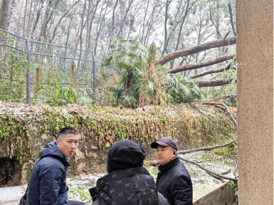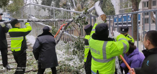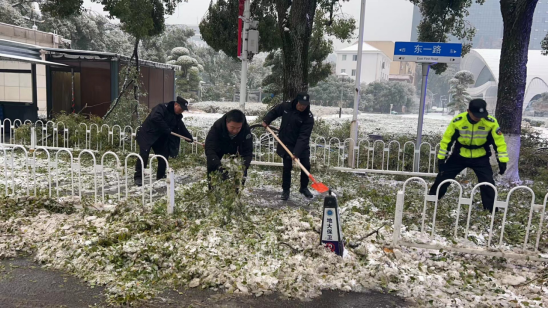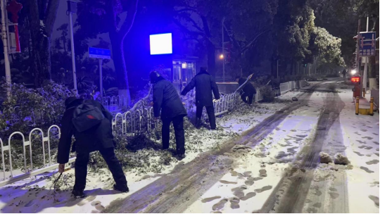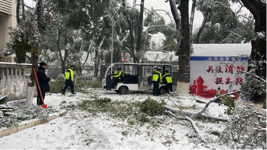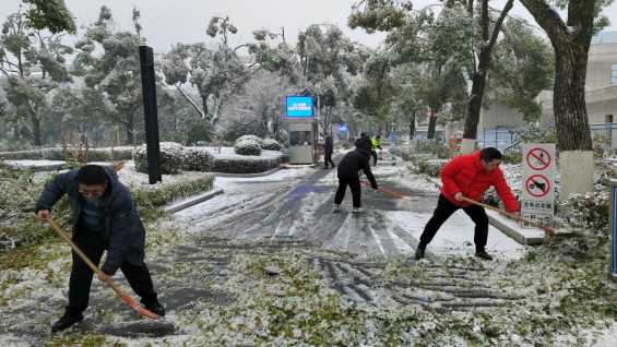灾情就是命令,安全就是责任。安全保卫部闻令而动,迅速启动极端天气应急处置预案,组织突击力量开展险情排查和校园交通安全保障。2月3日上午,部领导前往基地宿舍查看灾情,及时将受损房屋的队员转移临时安置。在报告园林管理部门后,立即组织部门值守人员和后勤部门同志一起清理屋顶和道路折断的树枝,没有工具,就徒手搬运。同时全面检查安全隐患,抢修电路,至下午4点,成功移除两颗即将倒下的树木,恢复基地供电。2月4日,路面冰冻积雪,交通受阻。天还没亮,安保部动员在校干部职工和一线安保队员分散到校园各门禁通道、鲁麿路人行天桥和隧道等重点交通路段紧急抢修。大家冒着严寒,挥舞着铁锹和扫帚,铲除道路积雪,清除拆落树枝,至中午12点,各大门及校内交通主干道障碍基本清除完毕,保障了车辆和行人顺利通行。为防止师生在冰雪路面滑倒,还特意在各主要路段、坡段、天桥上铺上了防滑袋和撒上融雪盐,确保行人安全。2月5日开始,安全保卫部取消轮休,在校人员全部投入工作岗位,深入开展隐患排查和除险工作,全力维护校园安全稳定秩序。