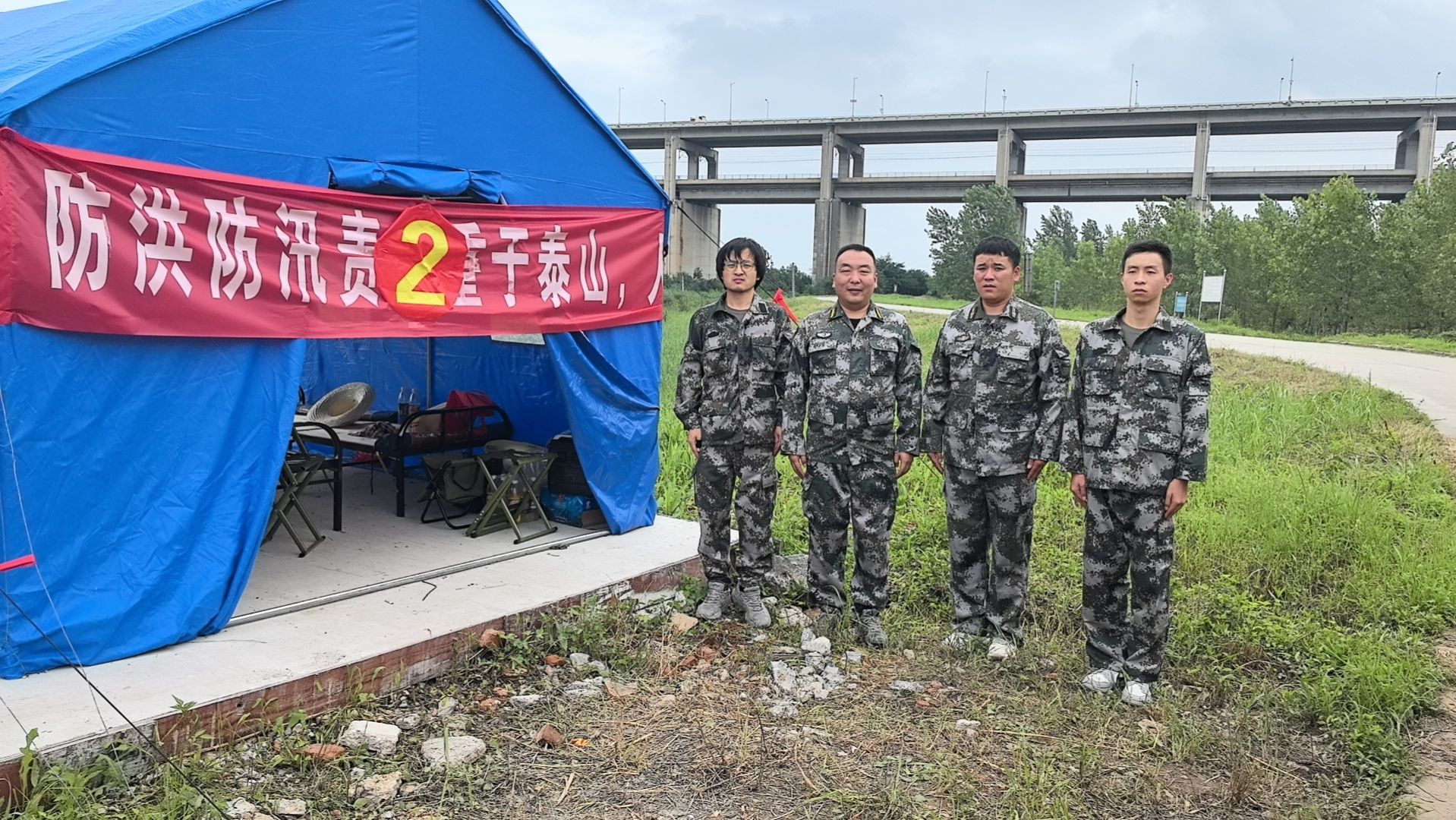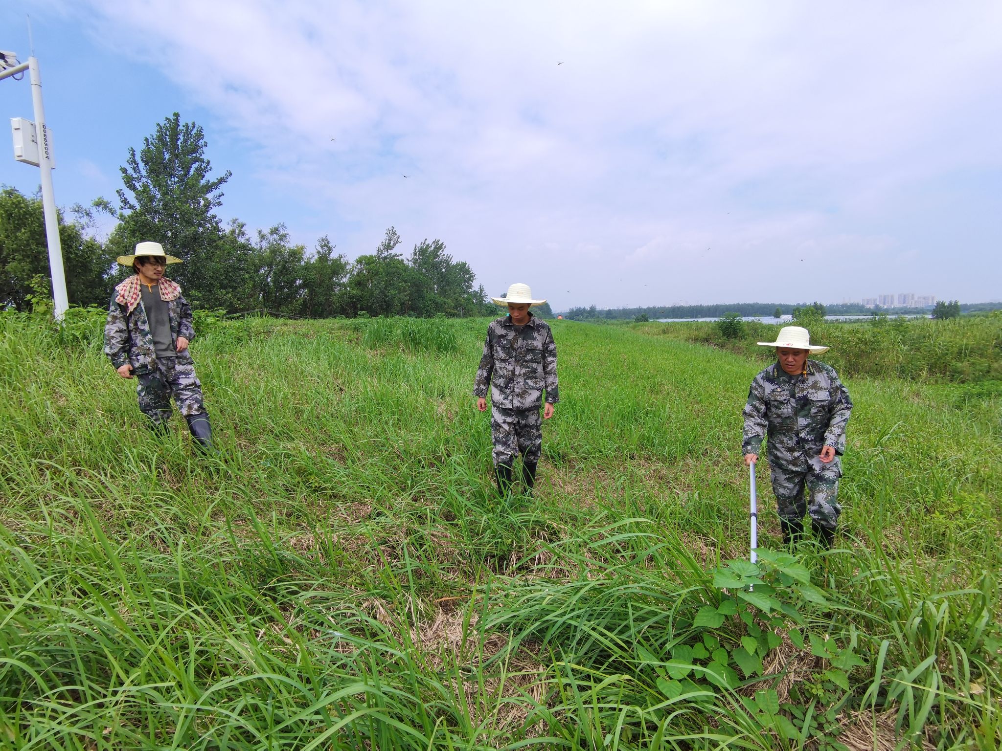 灾情就是命令。7月2日晚,接上级紧急通知,受连日降雨影响,长江水位超警戒,天兴洲堤坝出现险情,需要人员立即增援。当晚8时,中国地质大学(武汉)安全保卫部民兵应急分队闻令而动,迅速组织4位民兵同志作为第一梯队,紧急赶赴天兴洲防汛营地支援,投入巡堤查险任务。