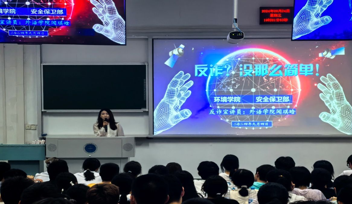 (通讯员:闻琪晗)新学期伊始,为了进一步强化校园安全教育,提高学生们的防骗意识,我校环境学院特别邀请安保部法律援助办主任魏景明和学生反诈宣讲员闻琪晗,于9月4日晚19:00点在教三楼207为环境学院全体新生们开展了一场别开生面的反诈骗宣讲活动。