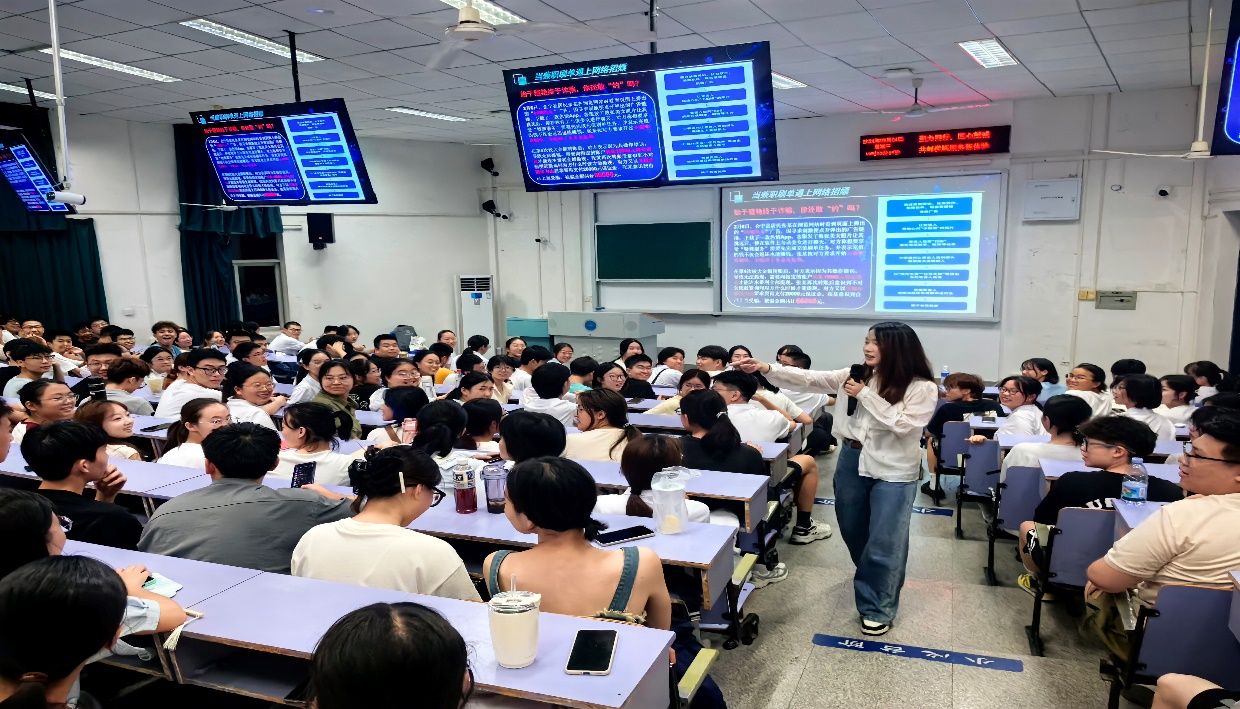 首先,学生反诈宣讲员闻琪晗以自己曾经遭遇的网络诈骗经历作为开场,生动地向同学们展示了诈骗分子的狡猾手段和网络诈骗的常见形式。她的亲身经历和生动讲解让在场的每一位新生都感同身受,深刻认识到网络诈骗的隐蔽性和危害性。她强调:“提高警惕,不轻信、不泄露个人信息,是防范网络诈骗的第一步”,同时提醒同学们不要相信“天下掉馅饼”,一定要做到“不贪、不听、不信、不转账”,切实保护自己的“钱袋子”。