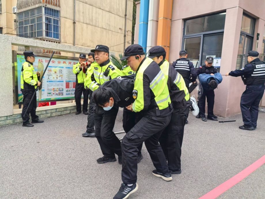 演练在学校东区附属学校门前进行,模拟场景设定为3名不法分子持械试图闯入校园内制造事端的紧急情况,治安科应急处突队员与喻家山派出所的民警们迅速响应,按照既定预案,分工明确、配合默契地展开了处置行动。演练过程包括快速出警、现场封控、嫌疑人抓捕等环节。同时,治安科其他人员迅速开展人员疏散、现场秩序维护等工作。整个演练过程紧张有序,环环相扣,达到了预期效果。