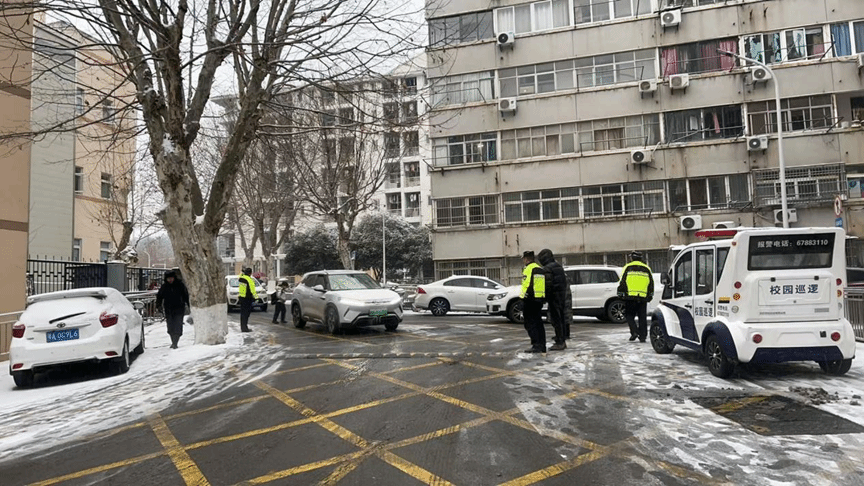 在研八上坡处、三峡中心上坡处、东北门上坡处易滑路段,多辆车打滑无法通行,造成早高峰食堂周边交通堵塞。治安科调集所有处突队员到东区食堂,加强指挥引导,提醒过往车辆减速慢行。期间,遇有多辆私家车因轮胎打滑无法前行,队员们毫不犹豫上前协助。他们一面指挥后方车辆注意避让,一面合力帮助车主推车,直至车辆安全驶离滑滞区域。风雪中,那一抹忙碌的安保制服身影,成为了寒冬里温暖的风景。