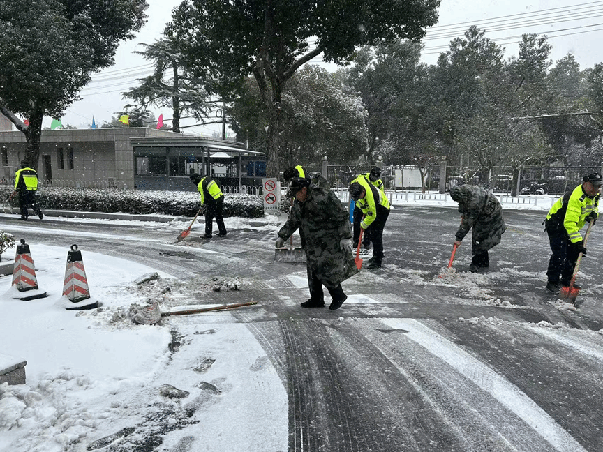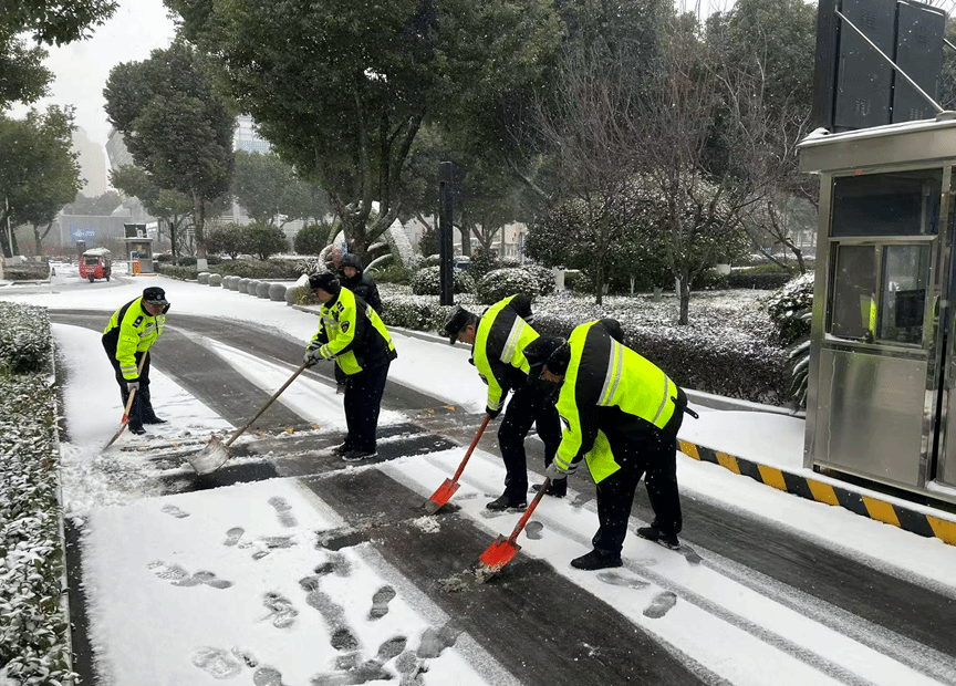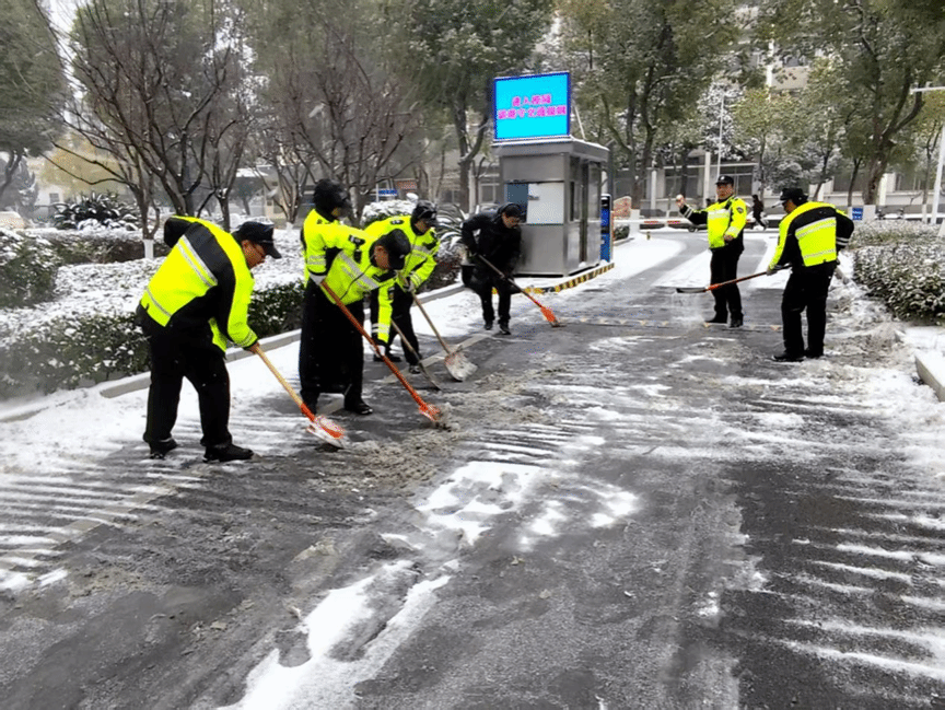 面对雪情,安保部迅速启动应急预案。处突队全体成员以雪为令,清晨提前到岗,顶着寒风,全力投入应急除雪与交通疏导工作。队员们挥动铁锹、扫帚,重点对全校区区大门闸机出入口、车辆进出主干道进行积雪清扫,竭力消除安全隐患。