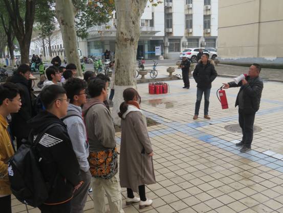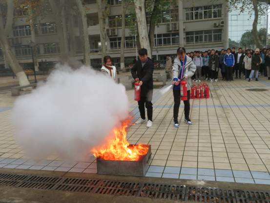 单红峰副处长从学校的治安现状,学生宿舍防盗,诈骗案件产生的社会环境,表现形式,防范措施等多方面与大家进行了交流,希望同学们增强自我防范意识。周日恒同志用近年发生的火灾案例,强调了遵守学校规章制度,不使用违章电器的重要性,并讲解了火灾报警,疏散逃生,灭火器使用等消防知识,指导大家在楼下进行了灭火器实操演练。