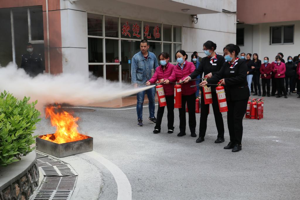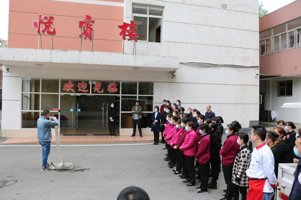 理论知识讲解之后,消防科组织大家在悦宾楼旁进行灭火器实操演练。