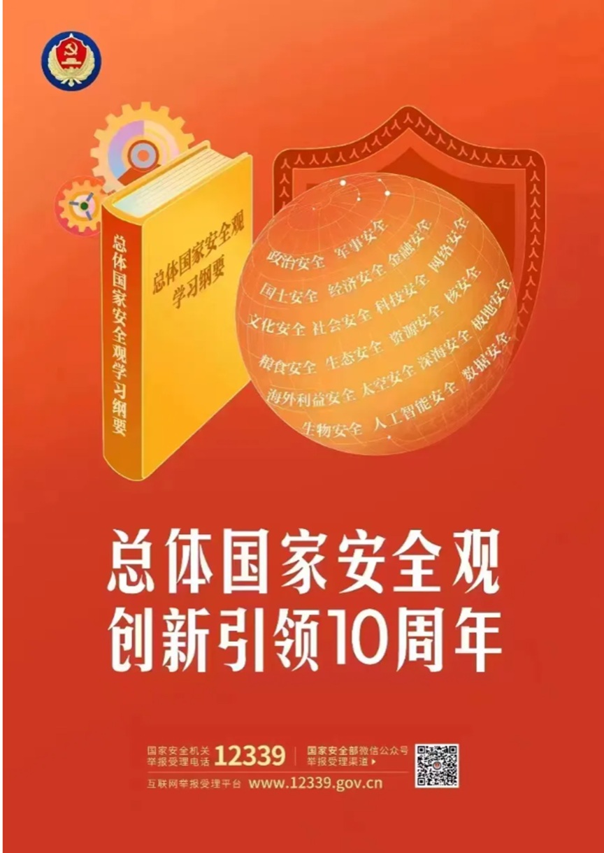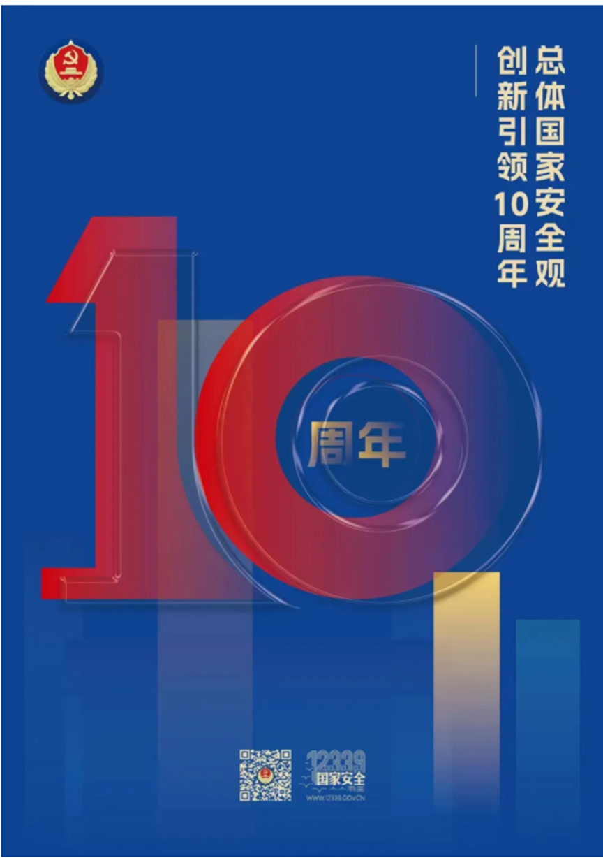 2014年4月15日,在中央国家安全委员会第一次会议上,习总书记创造性地提出了总体国家安全观,今年全民国家安全教育日宣传教育活动主题为“总体国家安全观·创新引领10周年”。十年坚守,巩固国家安全根基;十年积淀,汇聚国家安全力量。