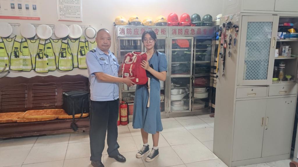 接案后,我科值班人员立即带领学生到监控室,因遗失位置不在监控范围之内,我们又马上带学生一起到喻家山派出所报案。我科通过ipad的定位功能,锁定遗失包大概位置在东区32栋。随后,我们在32栋逐一走访调查,最终于当天晚上19点帮学生找回遗失双肩包。