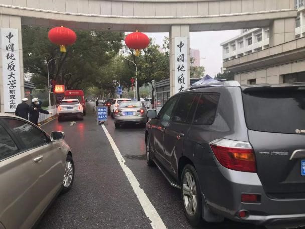 图为队员在东一门指挥交通、劝离堵塞车辆